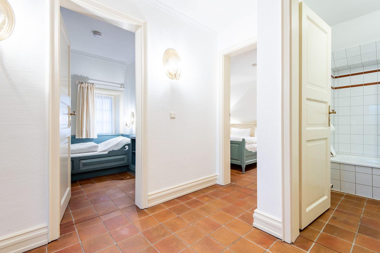 Das Hauptschlafzimmer ist mit einem gemütlichen Doppelbett (2x 80x200 cm) und maßgefertigten Tischlereinbauten eingerichtet. Das zweite Schlafzimmer verfügt über ein Einzelbett (90x190 cm) und ebenfalls über maßgefertigte Einbauten, die für zusätzlichen Stauraum sorgen. Das moderne Badezimmer ist mit Badewanne, Dusche, WC, Waschtisch, Handtuchtrockner und Fön ausgestattet und bietet höchsten Komfort.