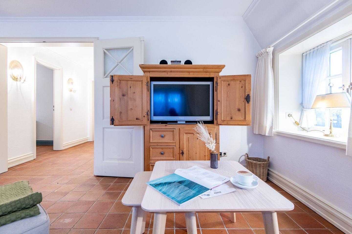 Der großzügige Wohn- und Essbereich strahlt Gemütlichkeit und Komfort aus und ist mit einem bequemen Sofa, TV und einer einladenden Essecke für 3 Personen ausgestattet. Durch den direkten Zugang zur Terrasse können Sie Ihren Morgenkaffee im Freien genießen oder abends die Sylter Brise spüren.