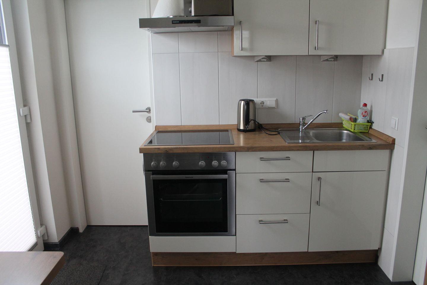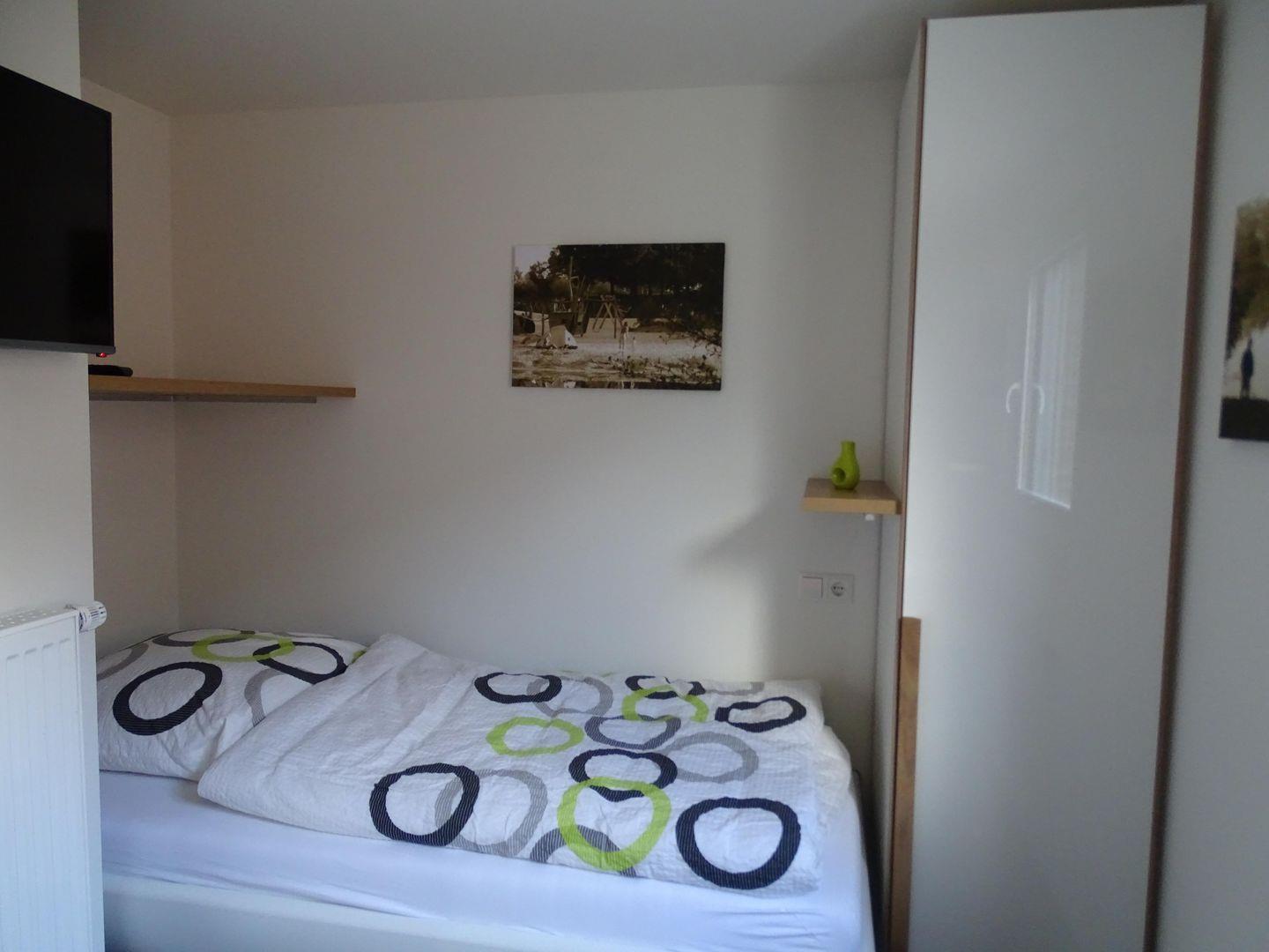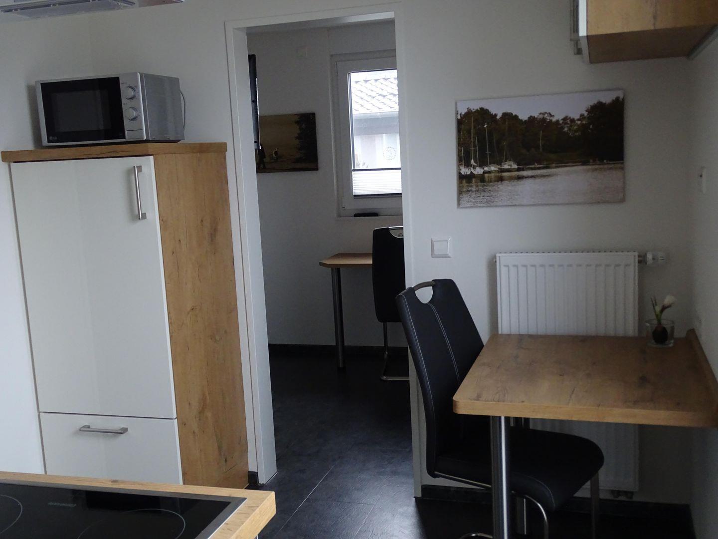 Die Wohnung verfügt über ein helles Schlafzimmer, das mit hochwertigen Möbeln und einer wohltuenden Atmosphäre zur Entspannung einlädt. Ein großzügiger Wohn- und Essbereich mit einem Esstisch und einer vollständig ausgestatteten, geschlossenen Küche macht das Kochen zu einem Vergnügen. Die moderne Küche beinhaltet alles Notwendige, von einem Backofen über einen Kühlschrank bis hin zu einer Mikrowelle und einem Wasserkocher. Hier können Sie gemütliche Frühstücke oder romantische Abendessen gemeinsam zubereiten.