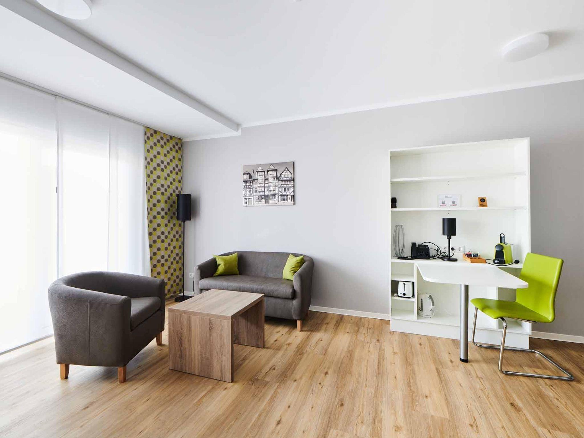 Unsere 27 stilvoll eingerichteten Einzel-Apartments mit 31 bis 39 qm Wohnfläche sind die perfekte Wahl für anspruchsvolles Wohnen auf Zeit. Große Glasfronten und eigene Terrassen lassen viel Tageslicht herein und schaffen eine helle, freundliche Atmosphäre. Jedes Apartment überzeugt mit durchdachtem Komfort: eine voll ausgestattete Küche, modernes Bad, großzügiger Stauraum und hochwertiges Interieur sorgen dafür, dass Sie sich vom ersten Moment an wohlfühlen. Im Gebäude stehen Ihnen zudem kostenfreie Waschmaschinen und Trockner, schneller WLAN-Zugang sowie gratis Kaffee zur Verfügung – für ein rundum angenehmes Wohnerlebnis.