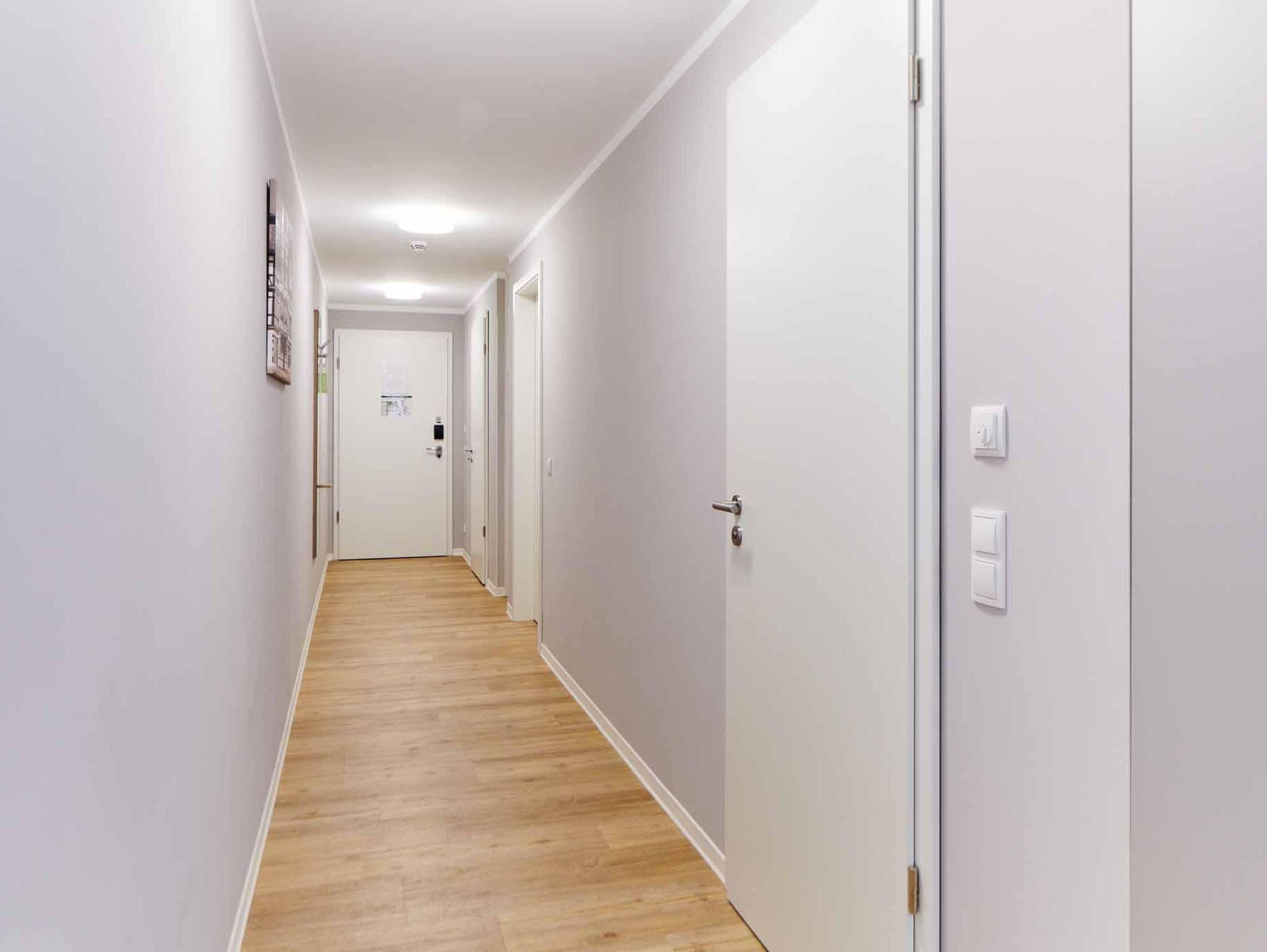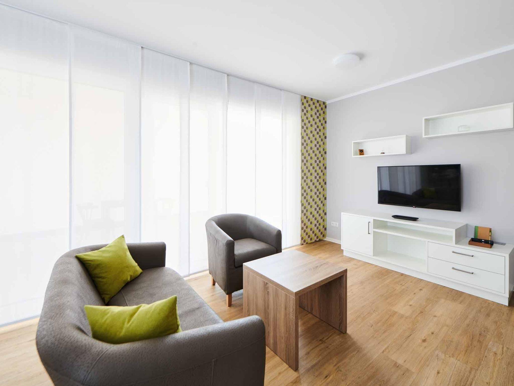 Unsere drei großzügigen Einzel- und Doppel-Apartments der Größe L mit 67 qm Wohnfläche bieten exklusiven Komfort für höchste Ansprüche. Großflächige Glasfronten und eine private Terrasse sorgen für viel natürliches Licht und ein offenes Raumgefühl. Die stilvolle Einrichtung, kombiniert mit durchdachter Funktionalität, schafft ein Zuhause auf Zeit, das sowohl ästhetisch als auch praktisch überzeugt. Eine voll ausgestattete Küche, ein modernes Bad sowie reichlich Stauraum gehören zur Standardausstattung. Zusätzlich profitieren Sie von kostenfreien Waschmaschinen und Trocknern im Gebäude, gratis Kaffee und schnellem WLAN – für ein rundum angenehmes und unabhängiges Wohnerlebnis.