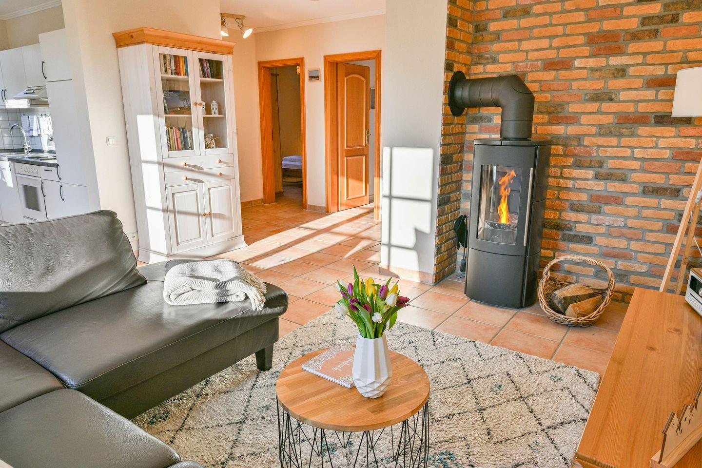 Die Ferienwohnung bietet Platz für bis zu 4 Personen. Sie hat einen offenen Wohnbereich mit einer gemütlichen Sofalandschaft, Flat-TV und Kamin. Die angrenzende offene Küche