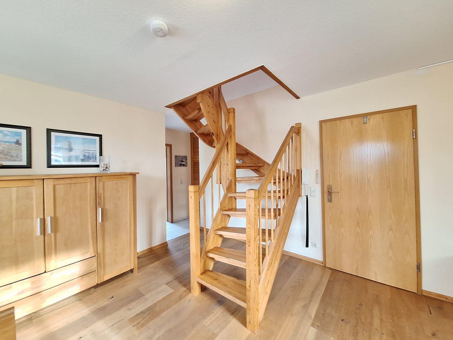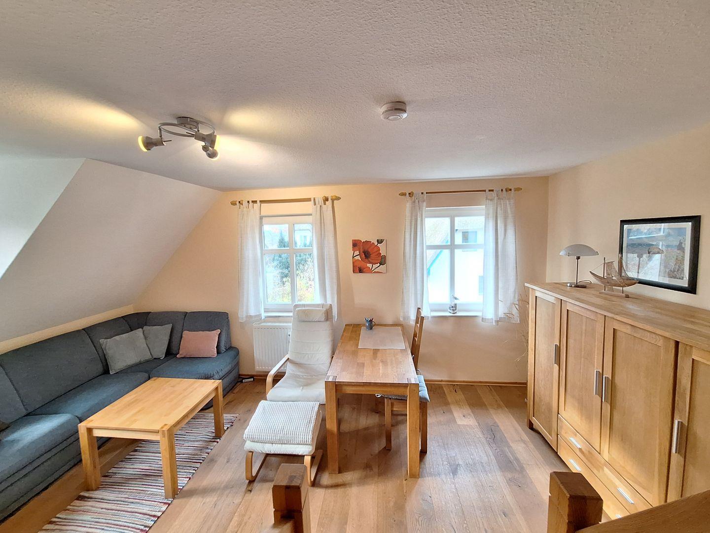 Gemütliche und ruhige Ferienwohnung, ideal geeignet für einen Aufenthalt zu zweit, gelegten in einer ruhigen Seitenstraße. Sie befindet sich im ersten Obergeschoss und verfügt über ein großzügiges Wohnzimmer, eine vollständig eingerichteten Küche sowie ein Bad mit Dusche und WC. Über eine Treppe gelangen Sie in das Schlafzimmer. Zur Wohnung gehört ein Fahrradschuppen, ein Stellplatz für Ihren PKW und ein Sitzplatz im Garten vor dem Haus.