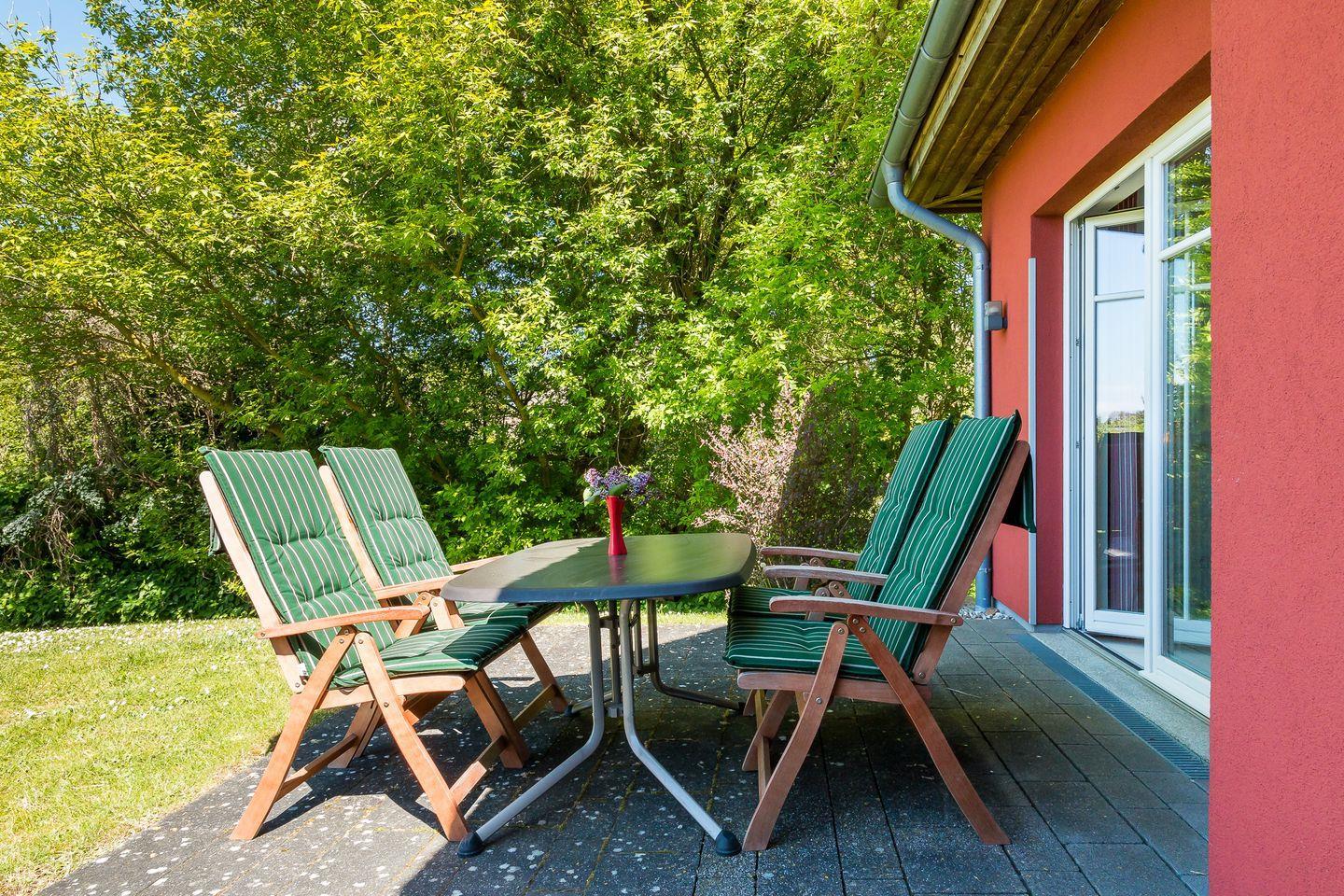 Im Außenbereich erwartet dich eine großzügige Steinterrasse mit Sonnenschirm und Bestuhlung. Hier kann der Tag bei einem sonnigen Frühstück starten oder mit einem tollen Sonnenuntergang am Abend enden. Zwei PKW-Stellplätze gehören zum Ferienhaus dazu.