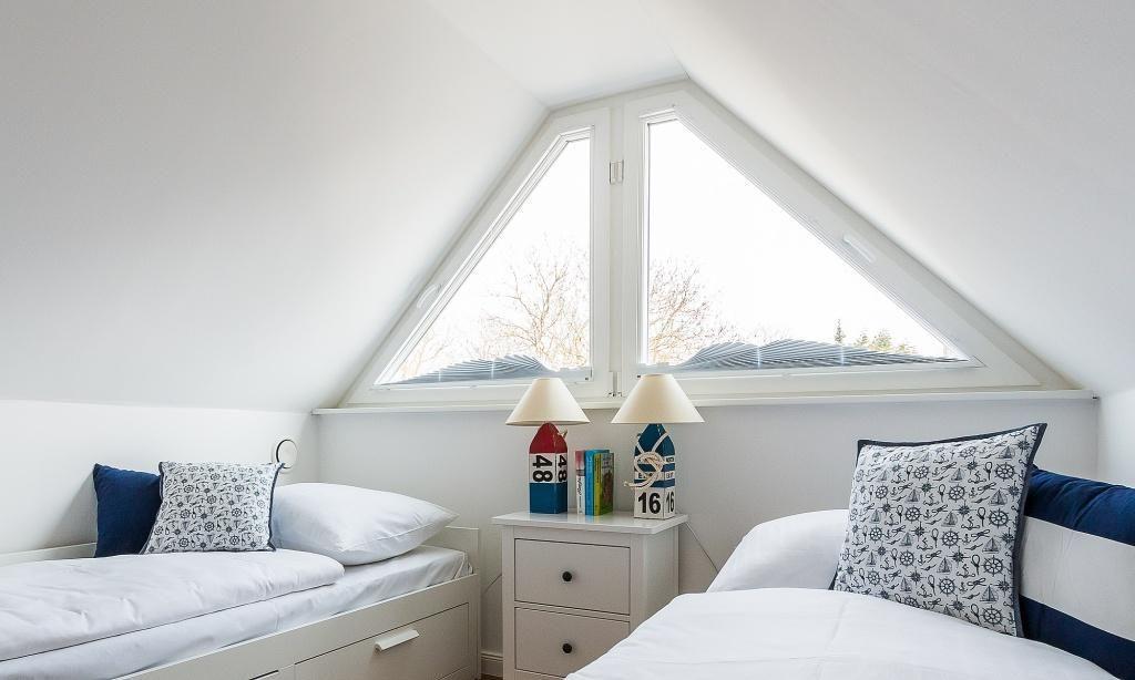 Im Dachgeschoss befindet sich ein drittes Schlafzimmer mit zwei Einzelbetten als zusätzliches Kinderzimmer oder Rückzugsort. Von hier hast du einen kleinen Boddenblick.