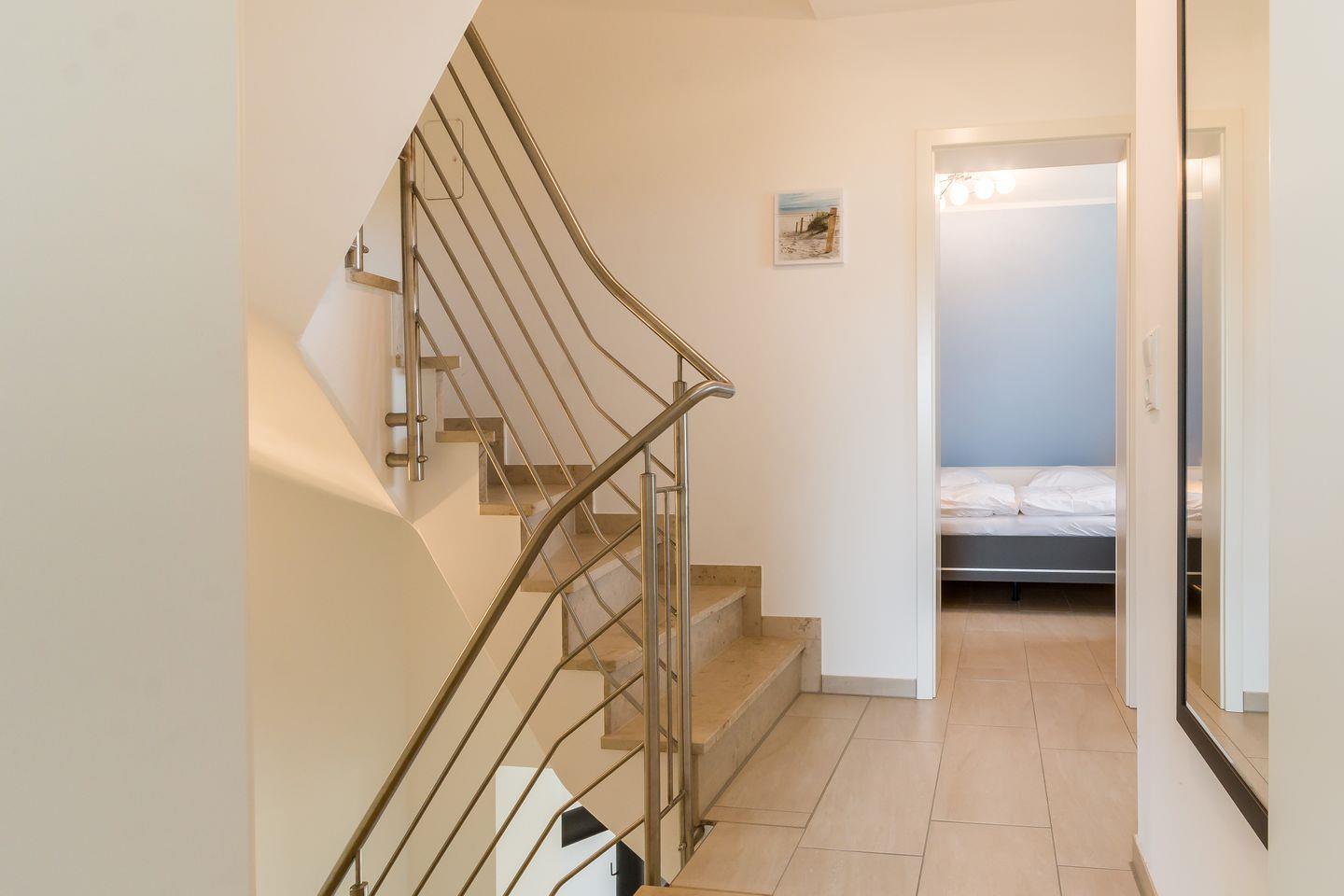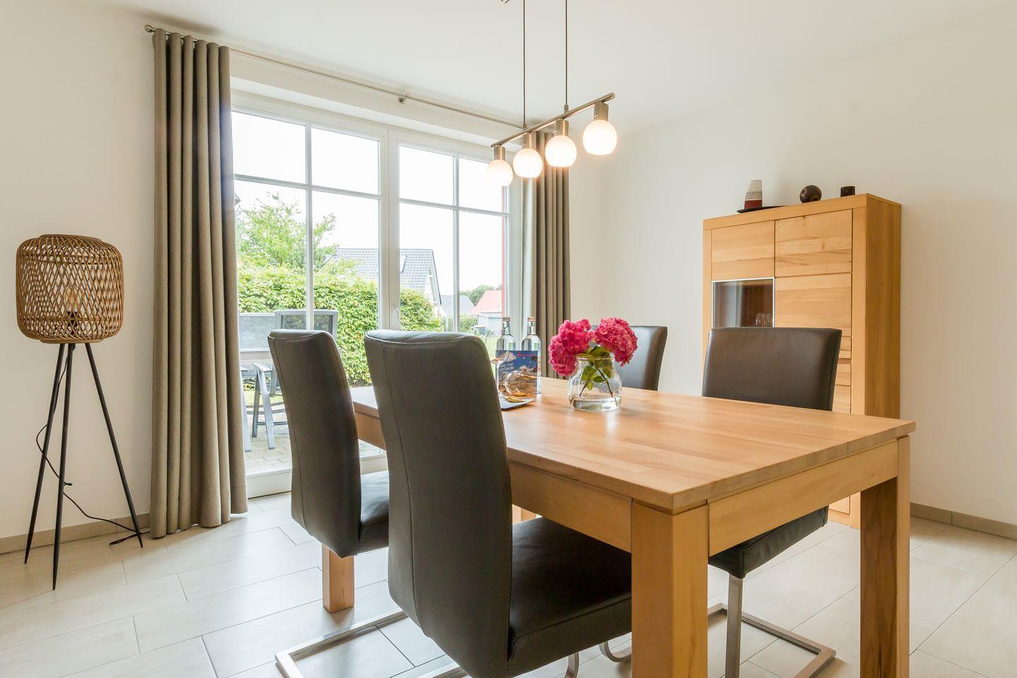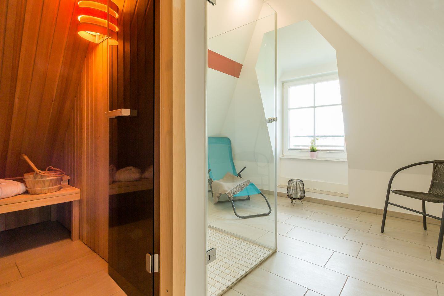 Im Erdgeschoss erwartet dich ein lichtdurchfluteter und großzügig gestalteter Wohnbereich mit gemütlicher Sofaecke am Kamin und großem TV. Offen und dennoch abgetrennt vom Wohnbereich befindet sich die moderne und vollausgestattete Küche mit sonnigem Essbereich. Hier lässt es sich nach ganz nach Gusto Kochen und Klönen. Ein erstes Tageslichtbad mit Dusche und WC gehört ebenfalls zum Erdgeschoss. Über eine Treppe gelangst du in das erste Obergeschoss und den Schlafbereich des Hauses. Das Hauptschlafzimmer ist clean gestaltet, mit hochwertigem Doppelbett, Kleiderschrank und Verdunklungsvorhängen für einen erholsamen Schlaf. Das zweite Schlafzimmer verfügt über zwei Einzelbetten. Ein modernes Tageslichtbad mit Dusche und WC bietet zusätzlichen Wohnkomfort und genug Rückzugsraum für die ganze Familie. Ein besonderes Highlight ist der kleine Wellnessbereich im Dachgeschoss mit Sauna, Dusche und Ruhebereich.