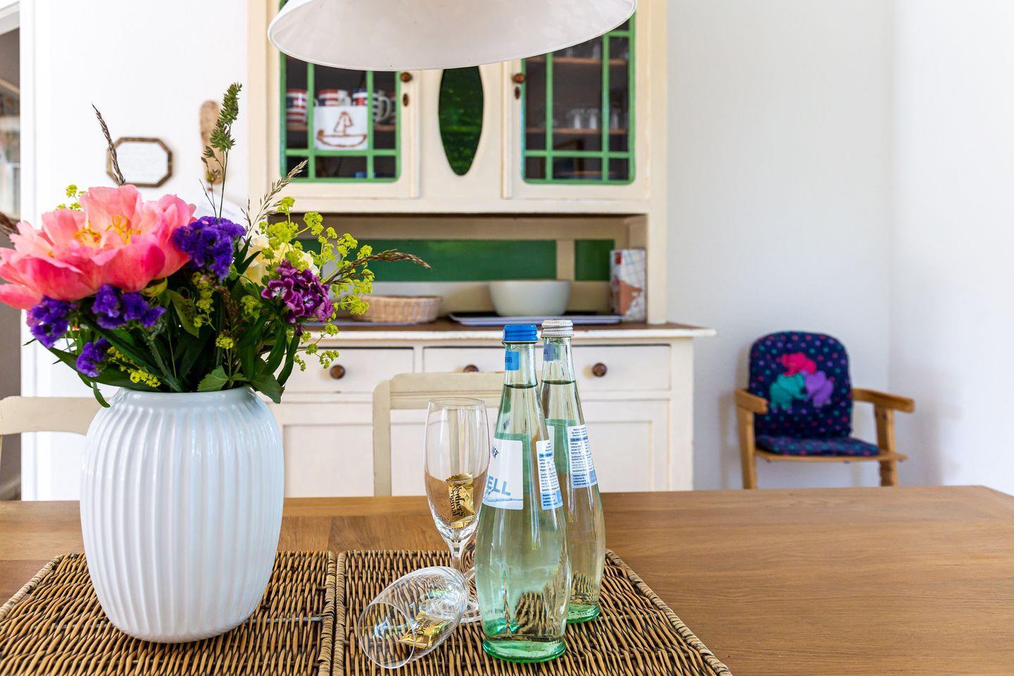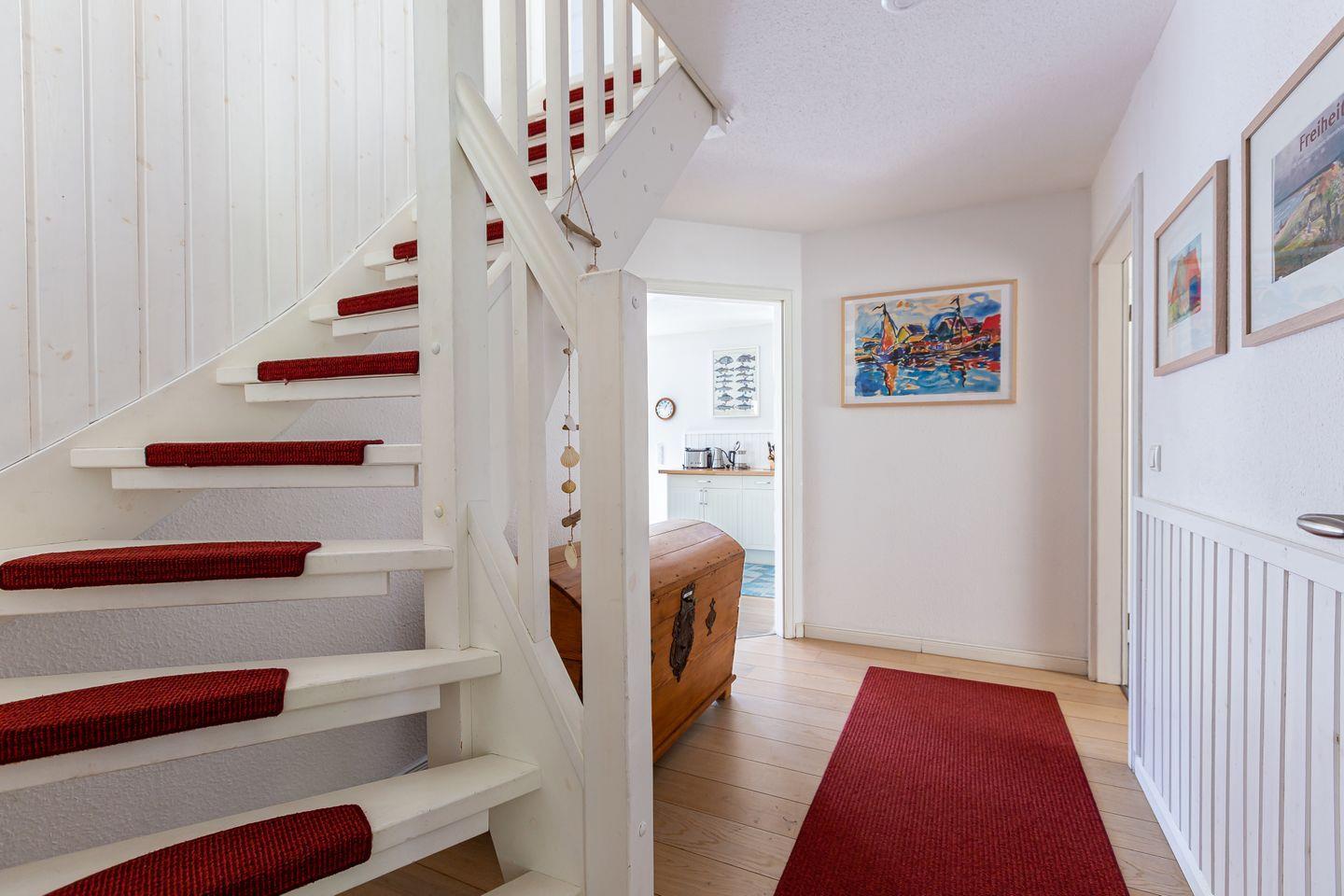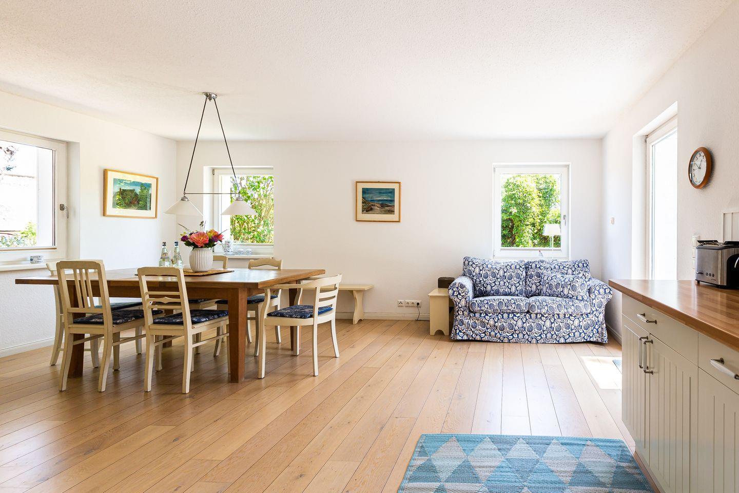 Durch den Eingangsbereich mit einer original Darßer Haustür gelangst du in den einladenden Wohnraum, der über eine gemütliche Sitzecke am Kaminofen, Bibliothek, Leseecke mit Ohrensessel und Zugang zur Westterrasse verfügt. Die großzügige, bestens ausgestattete Küche befindet sich separat. Besonders schön ist der edle und große Landhaustisch, an dem die ganze Familie Platz hat. Von der Küche hast du Zugang zur Süd-/Ost-Terrasse. Für ein besonderes Urlaubsfeeling sorgt das Wellnessbad mit Sauna, Badewanne und großem Austritt auf die West-Terrasse. Im Obergeschoss befindet sich ein großes Schlafzimmer mit Doppelbett, TV und Schreibtisch. Dank der schnellen Internetverbindung mit 100 MBit/s kannst du deinen Urlaub auch mit der Arbeit verbinden. Des Weiteren befindet sich ein zweites Schlafzimmer, ebenfalls mit einem Doppelbett und wunderbarem Waldblick und ein drittes Schlafzimmer mit zwei Einzelbetten im Obergeschoss. Für zusätzlichen Wohnkomfort sorgt ein zweites Bad mit Dusche/WC auf der oberen Etage.