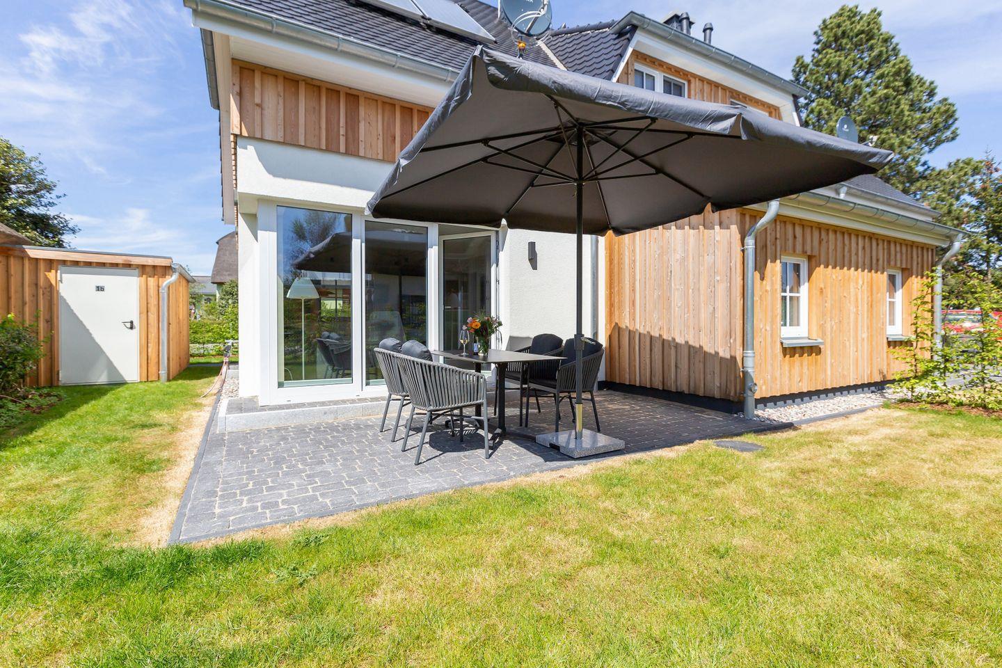 Der Außenbereich begeistert mit einem gepflegten Garten und zugehöriger Steinterrasse, die vor allem in den warmen Sommermonaten nach draußen lockt. Eine E-Bike-Ladestation, zwei PWK- und abschließbare Fahrradstellplätze im Gartenhaus stehen ebenfalls zur Verfügung. So klingt Ferienhausurlaub in einem der schönsten Dörfer der Halbinsel? Finden wir auch und wünschen schon jetzt einen traumhaften Aufenthalt.