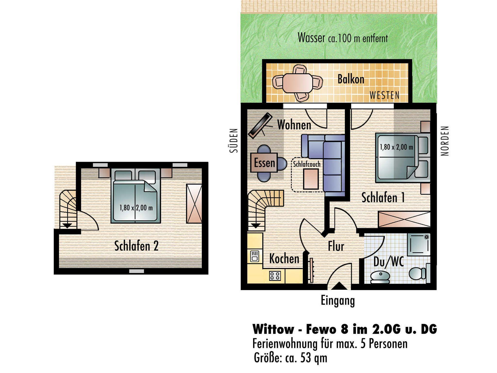 Die Ferienwohnung verfügt über zwei separate Schlafzimmer mit jeweils einem Doppelbett (2,00 x 1,80m, einzelnen 21cm dicken Komfort-Kaltschaum-Matratzen sowie sehr guten Lattenrosten). Ein Schlafzimmer befindet sich im Dachausbau und ist über eine offene Treppe vom Wohnzimmer aus zu erreichen. Es ist mit einem Highboard ausgestattet und durch eine Tür abschließbar. Im anderen Schlafzimmer befindet sich ein großer Kleiderschrank.