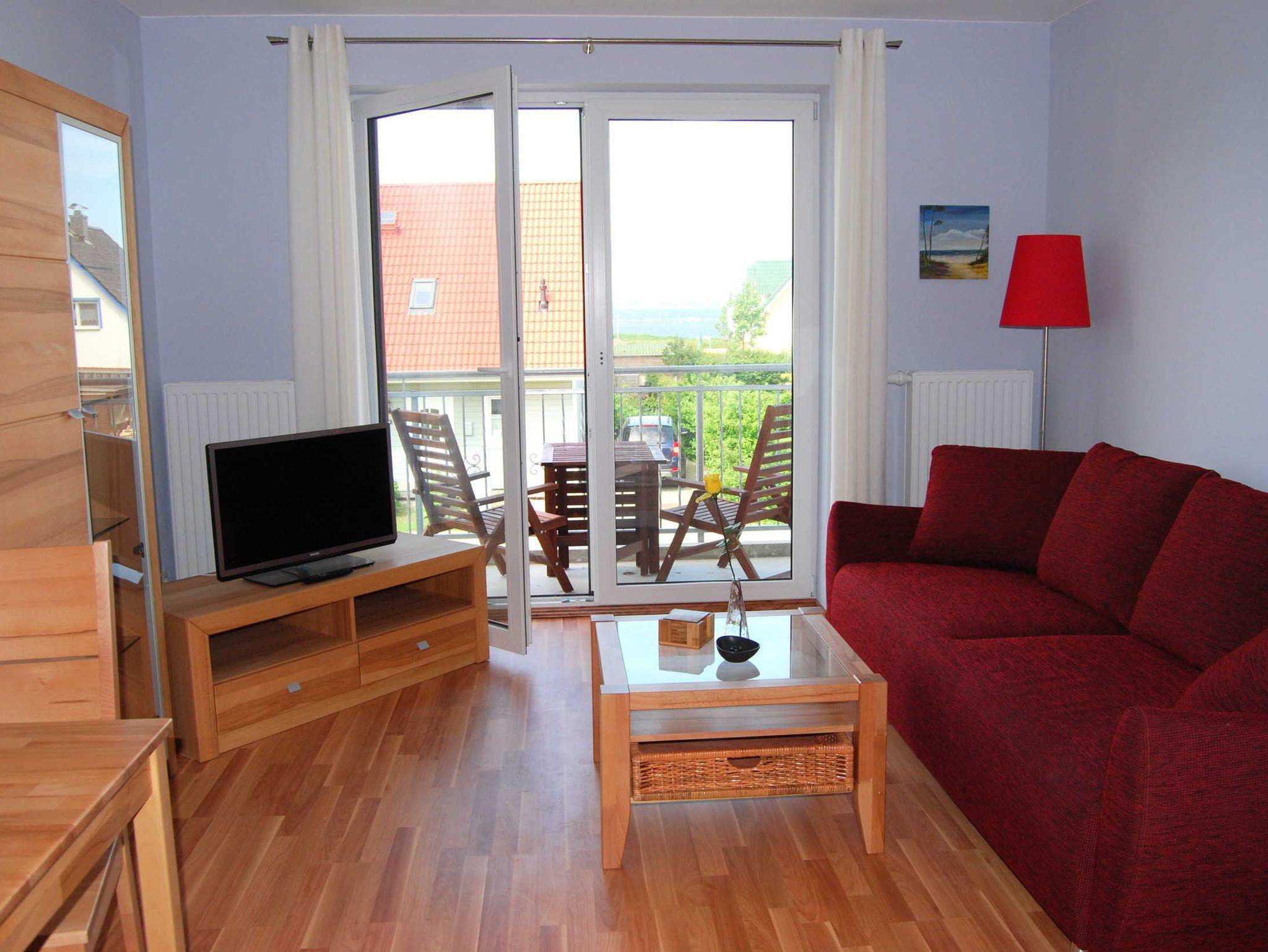 Die modern, hell und individuell ausgestattete ca. 40 qm große 2-Raum-Ferienwohnung in Wiek befindet sich im 1. Obergeschoss in der Villa Wittow im Ort Wiek auf der Insel Rügen. Vom Wohn- und Schlafraum gibt es direkten Zugang zum großen Balkon, von dem aus man einen Blick durch die Gärten der benachbarten Wohnhäuser bis zum Wieker Bodden hat.