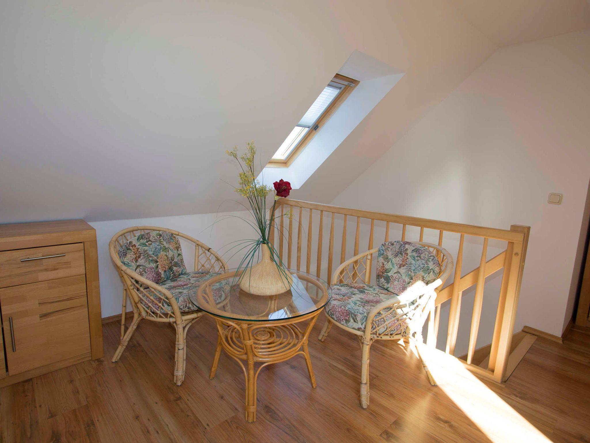Die Ferienwohnung verfügt über zwei separate Schlafzimmer mit jeweils einem Doppelbett (2,00 x 1,80m, einzelnen 21cm dicken Komfort-Kaltschaum-Matratzen sowie sehr guten Lattenrosten). Ein Schlafzimmer befindet sich im Dachausbau und ist über eine offene Treppe vom Wohnzimmer aus zu erreichen. Es ist mit einem Sideboard ausgestattet. Im zweiten Schlafzimmer befindet sich ein großer Kleiderschrank.