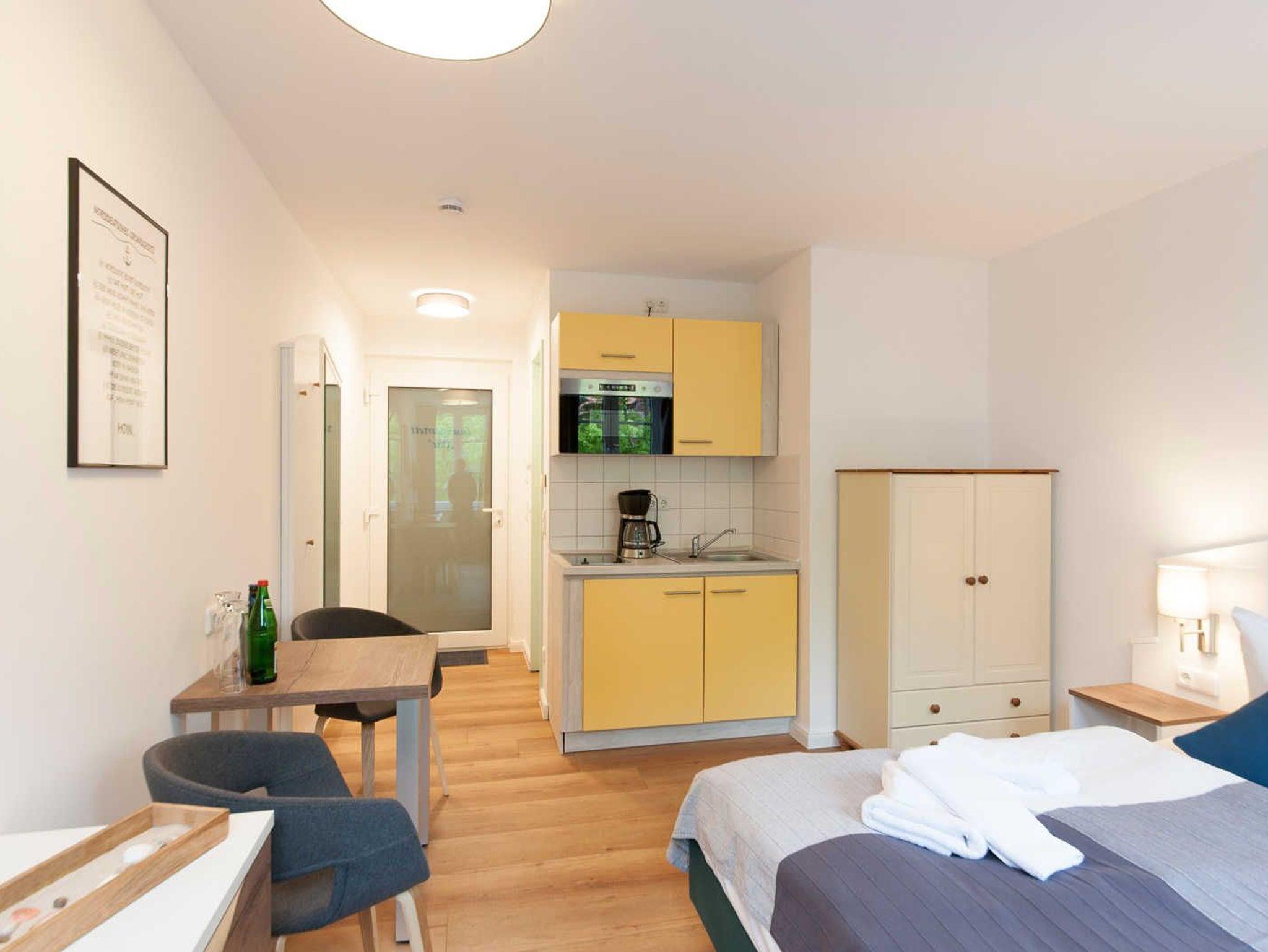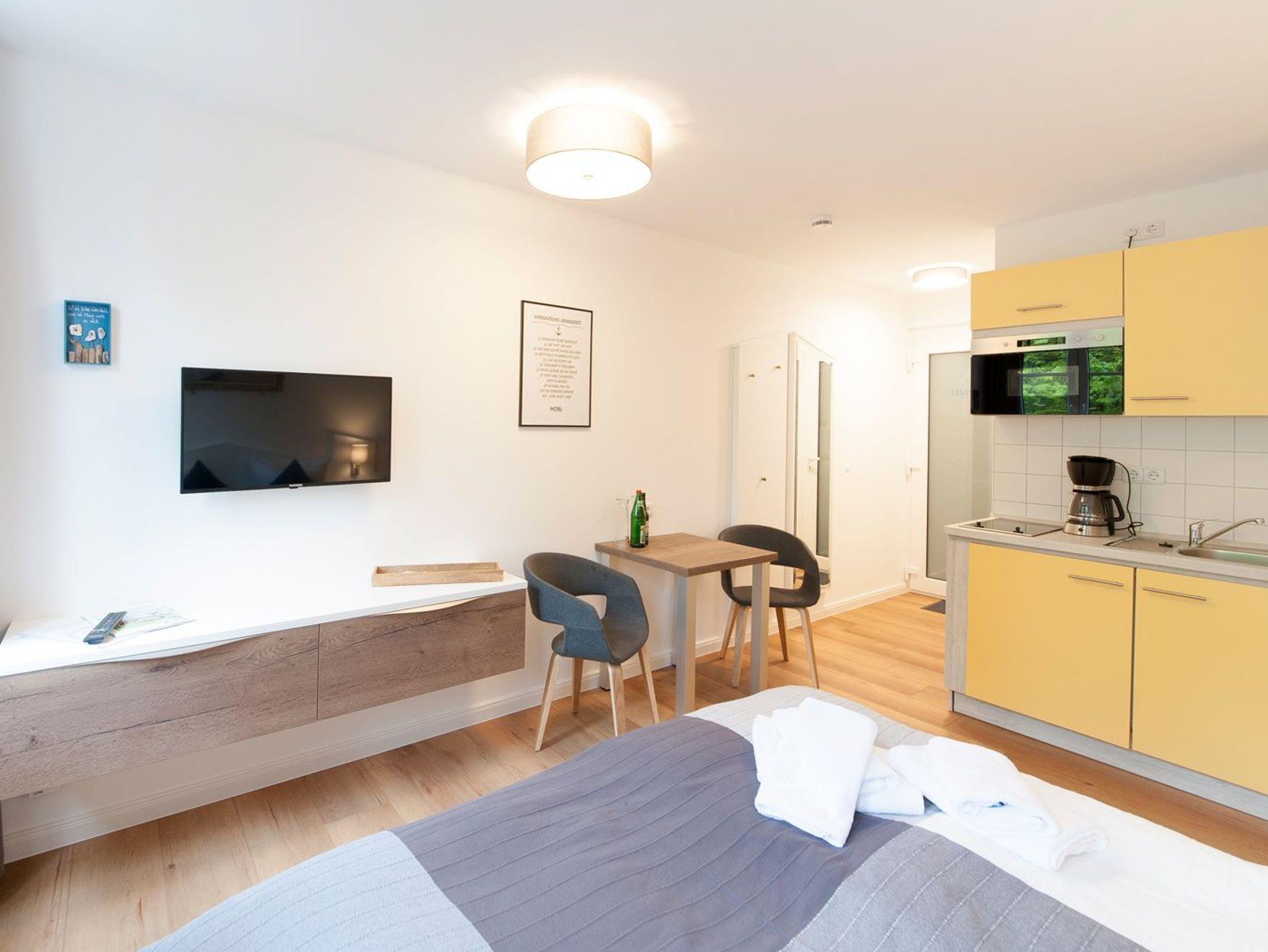 Die Küche verfügt über ein 2-fach Ceranfeld, Mikrowelle oder Backofen, Kühlschrank mit kleiner Gefriermöglichkeit, Kaffeemaschine oder Kaffeepresse, Toaster und Wasserkocher. Das Bad ist mit Dusche ausgestattet. Die Appartements haben selbstverständlich kostenlos WLAN/Internet, ein SMART-TV, sodass Mediatheken/youtube geschaut werden können und mit einer Spielesammlung kann man den Abend gemütlich ausklingen lassen.