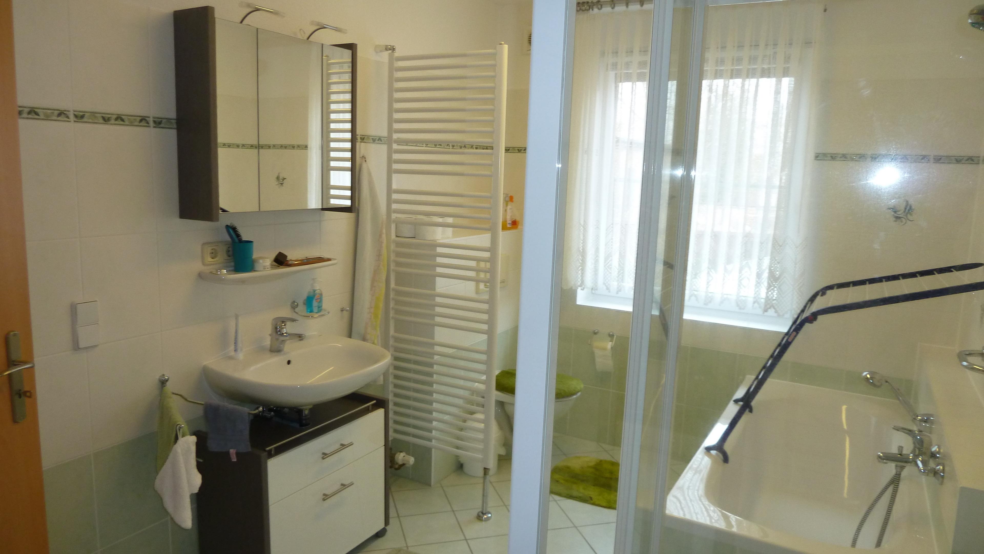 Des Weiteren stehen Ihnen ein großes Badezimmer mit Dusche, Badewanne und Toilette sowie ein Gäste-WC, Münzwaschmaschine und eim Kinderreisebett bei Bedarf zur Verfügung.