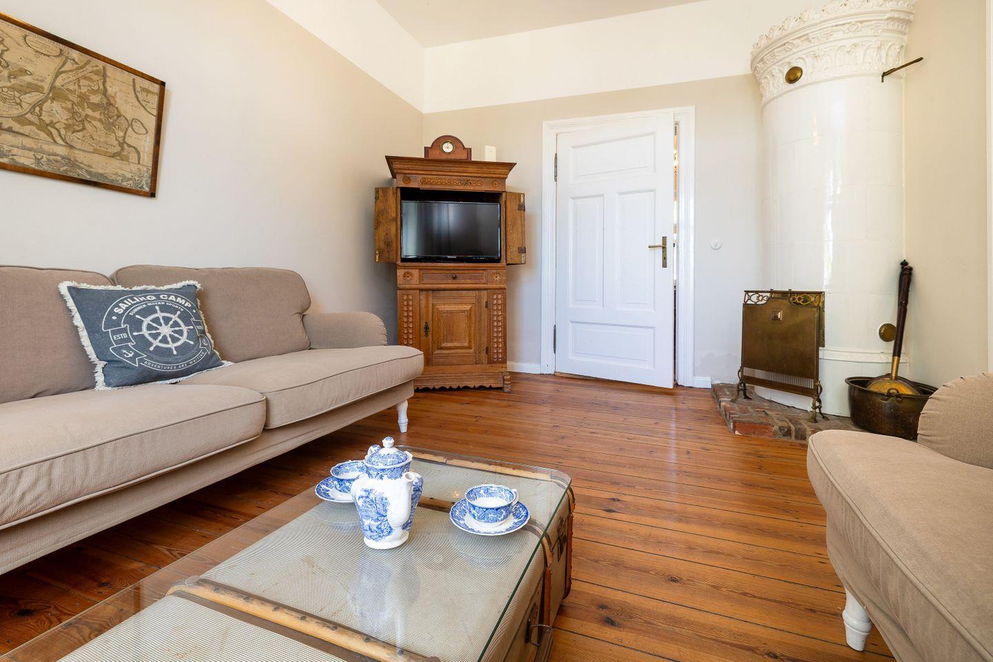 WOHNEN // Wohnraum mit Kaminofen, Sitzgarnitur mit bequemer Couch, Kabel-TV ++