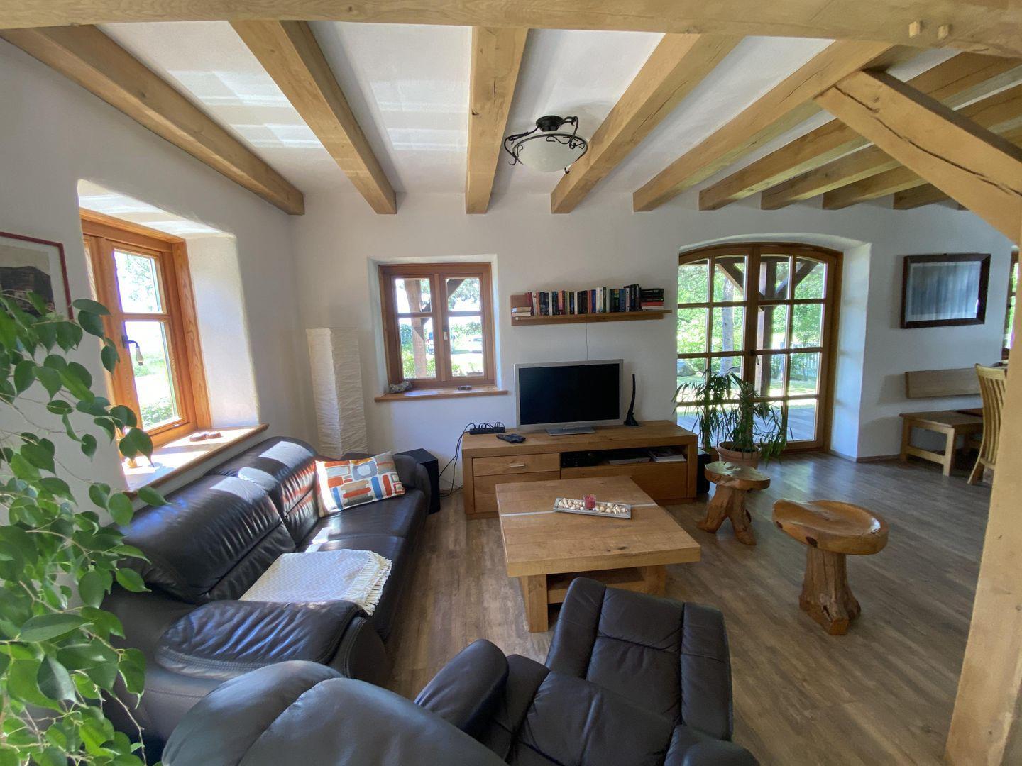 Im Erdgeschoss finden Sie eine moderne, voll ausgestattete Landhausküche, die keine Wünsche offenlässt. Das Esszimmer mit seiner gemütlichen Eichenholzeckbank ist der perfekte Ort für gesellige Mahlzeiten. Der offene Wohnbereich mit Ledercouch und Stressless-Sessel, viel naturbelassenem Eichenholz und Natursteinmauern schafft eine warme und einladende Atmosphäre. Die Küche ist vollständig ausgestattet. Ein Badezimmer mit WC und Dusche sowie ein Hauswirtschaftsraum mit Waschmaschine und Trockner runden das Angebot im Erdgeschoss ab. Von der Terrasse aus haben Sie Zugang zum Garten mit einer schönen Rasenfläche.