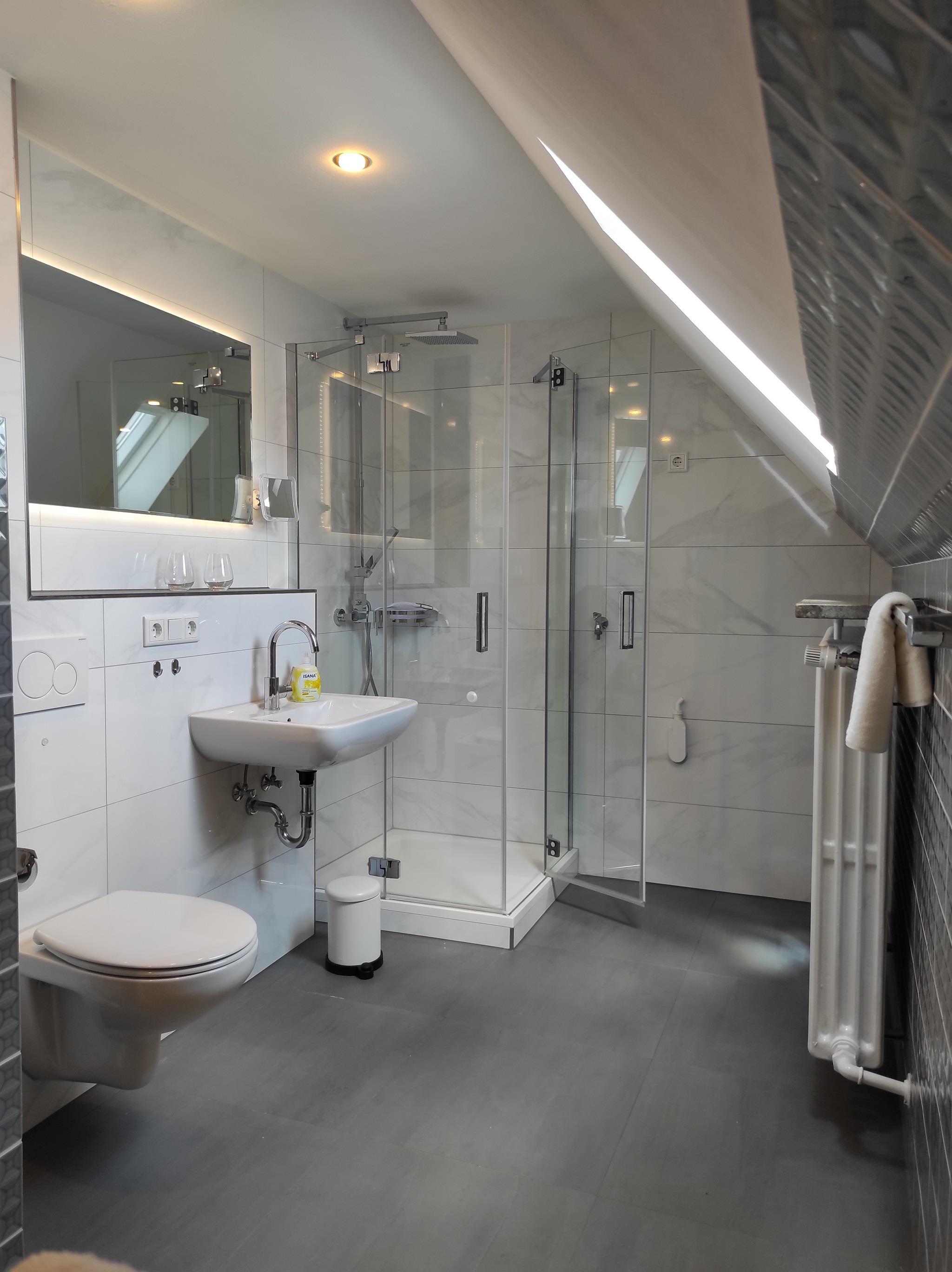 Das geräumige Badezimmer mit Toilette sowie mit Dusche, großem Spiegel und einem Fenster rundet das Gesamtbild ab.