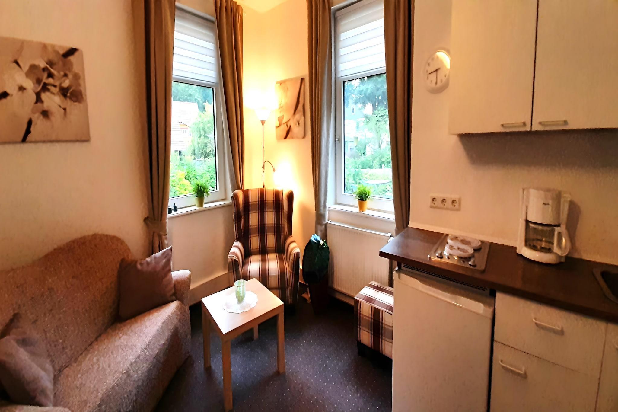 This charming ground-floor apartment in Wildemann offers a cozy and convenient stay just 100 meters from the town center and forest. Ideal for couples or solo travelers, it’s a perfect base to explore the Harz region’s rich heritage. Nearby attractions include the 19-Lachter-Stollen mine, the Imperial Palace of Goslar, and the Gustav Adolf Stave Church in Hahnenklee. For nature lovers, the Feigenbaumklippe and Treppenstein rock formations promise breathtaking views and peaceful hikes. Inside, the apartment features a welcoming living/dining room with a flatscreen cable TV, dining table, and seating area. The open kitchen is equipped with a coffee machine, electric kettle, cooker, and fridge—perfect for preparing simple meals. A comfortable bedroom with a double bed and its own TV ensures restful nights, while the bathroom includes a shower, washbasin, and toilet. Central heating and on-site parking add to the convenience. Surrounded by forest trails and just 7 km from ski slopes, the location is ideal for year-round outdoor adventures. Dining options nearby include the hearty Harzer Speisekammer, the inviting Cafe am Bohlweg Georgiew, and the Italian-inspired Piccolo Mondo Hahnenklee.