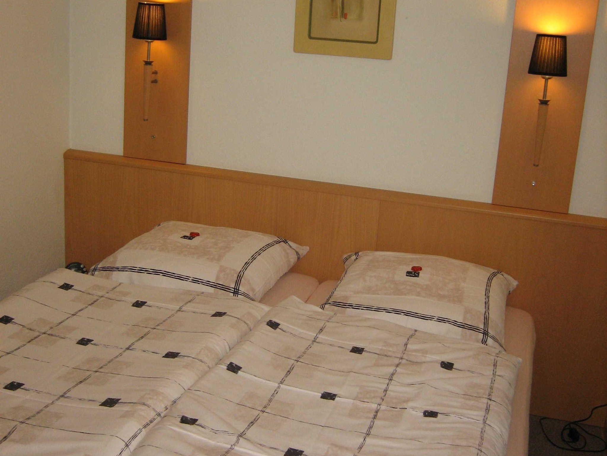 Die Betten im Schlafzimmer können auf Wunsch als Doppel- oder Einzelbetten gestellt werden.