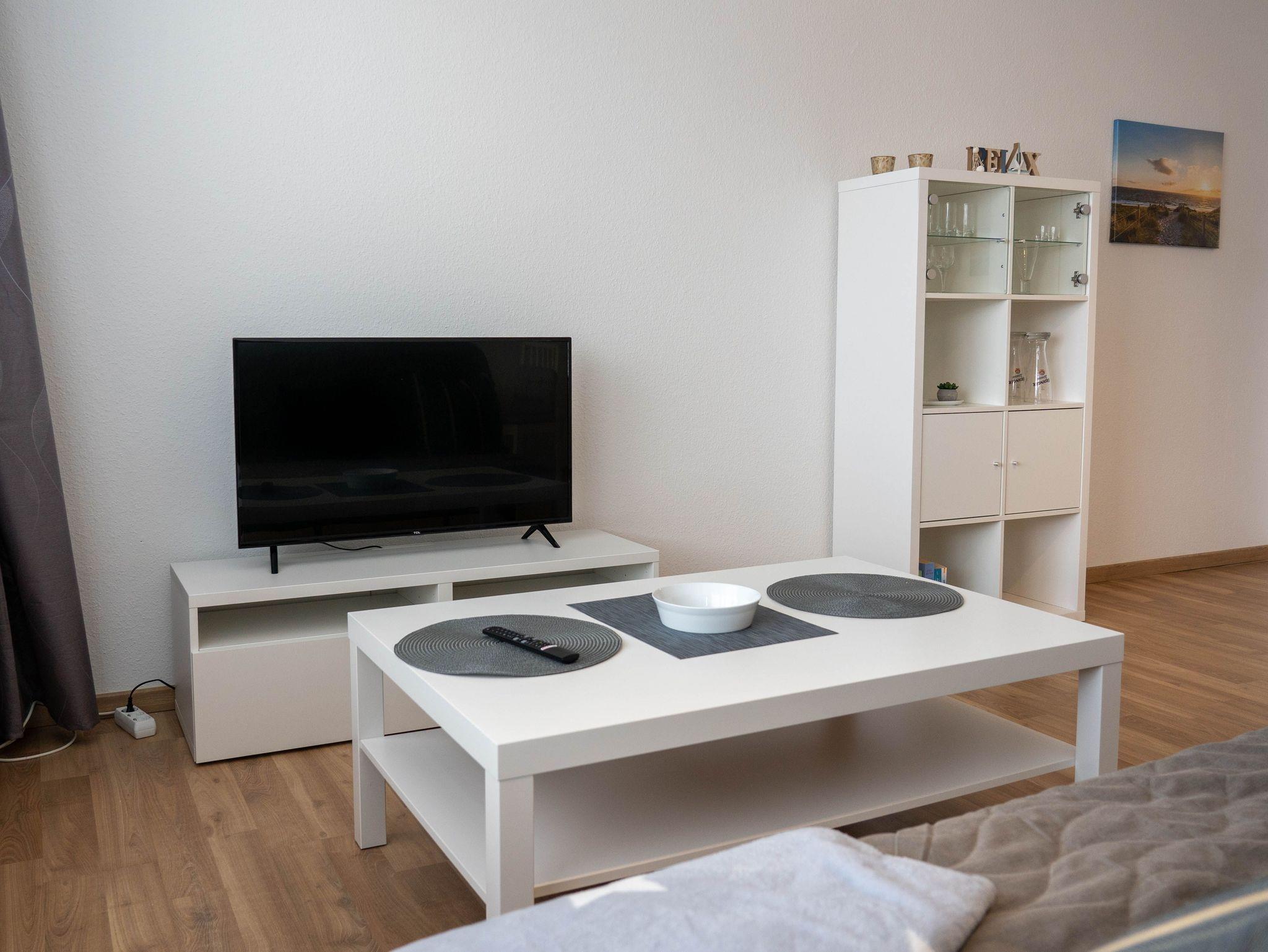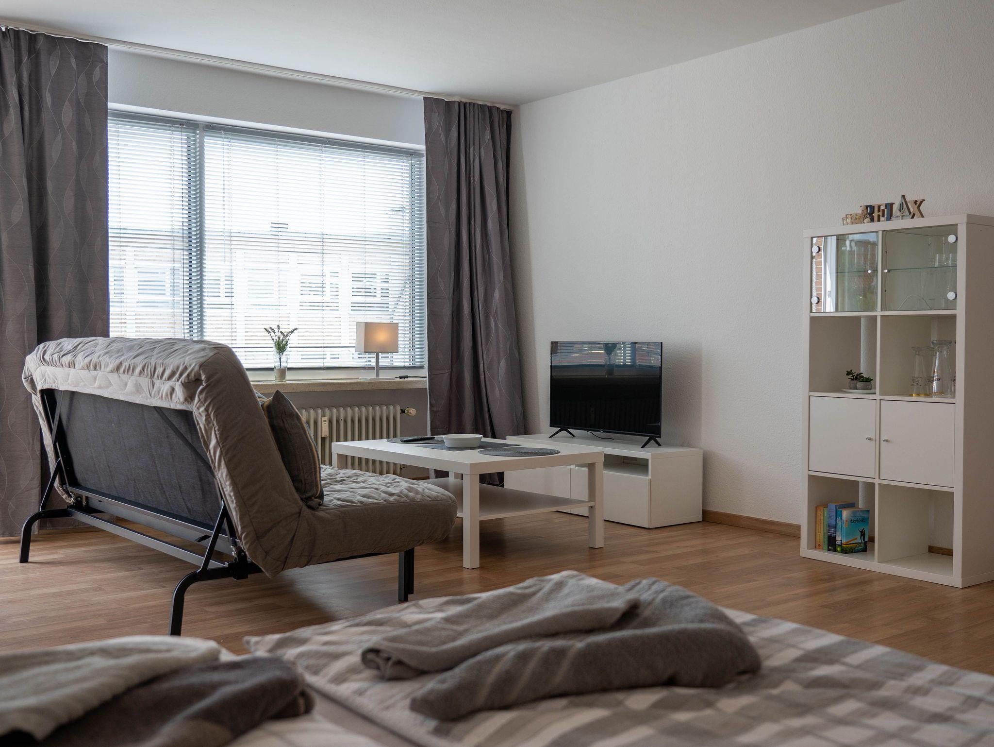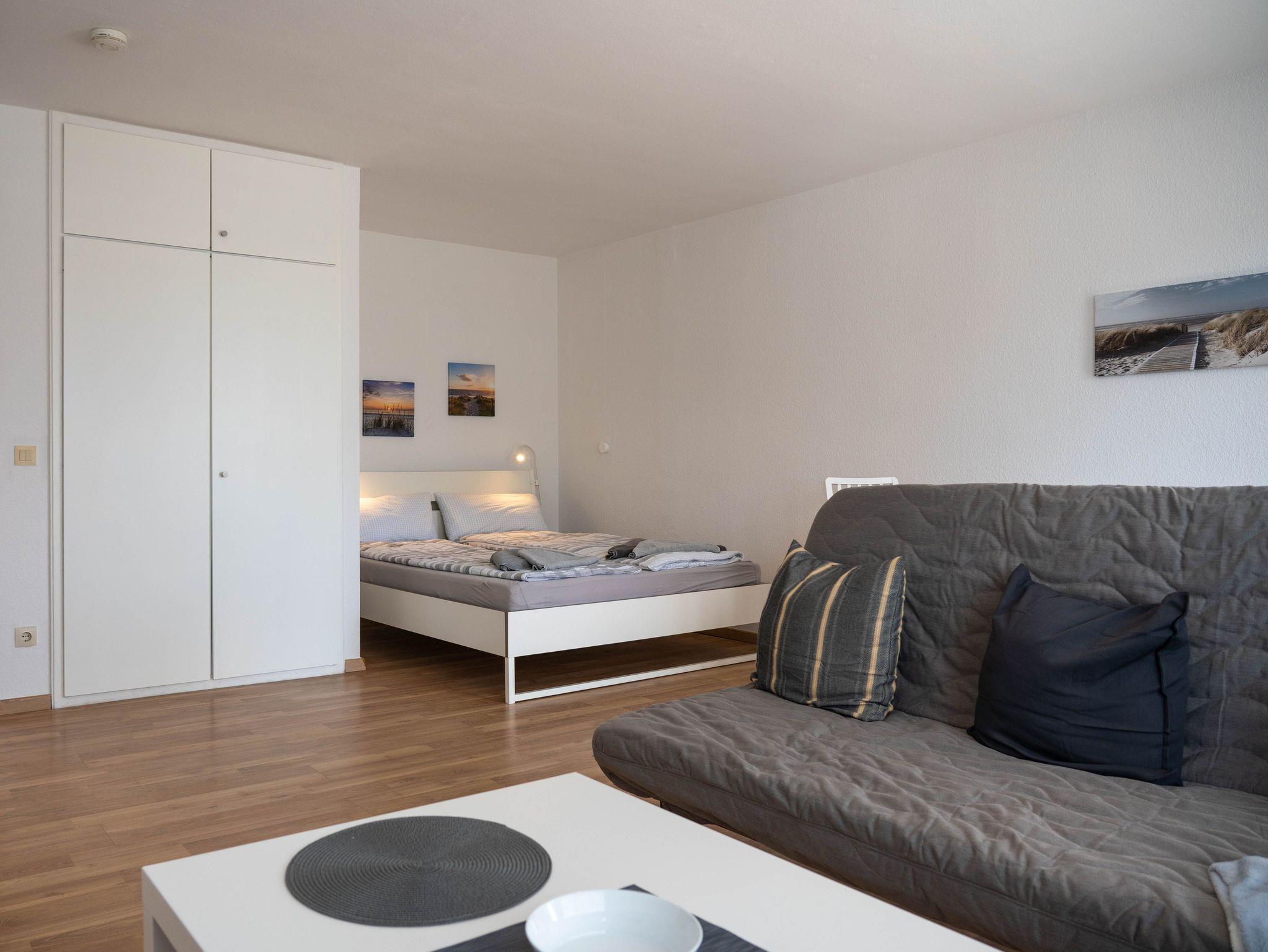 Modernes und geschmackvolles 1-Zimmer-Apartment mit Süd-Balkon und voll ausgestatteter Einbauküche, Duschbad, WLAN sowie Doppelbett und Schlafsofa und modernem Smart-TV.