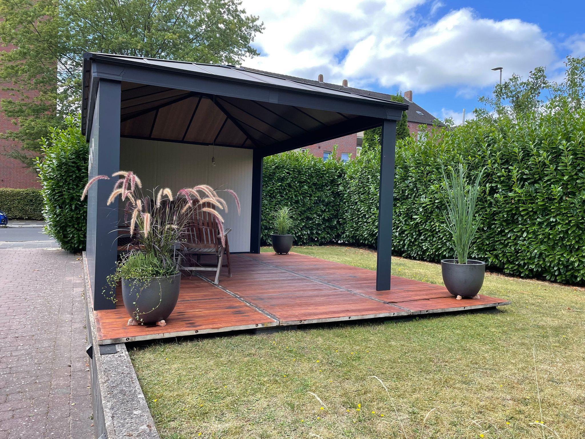 Zur Studiowohnung gehört ein überdachter Außensitzplatz. Mitgebrachte Fahrräder können untergestellt werden.