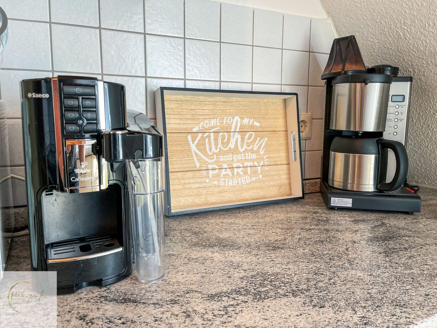 Im offenen, hellen Wohn- und Essbereich befindet sich ein Esstisch, an dem Sie gemeinsam Ihre Mahlzeiten einnehmen können. Die separate, abgeschlossene Küche ist umfangreich ausgestattet: Sie verfügt über einen 4-Platten-Elektroherd, Backofen, Mikrowelle, Geschirrspüler, Kühlschrank mit Gefrierfach, Wasserkocher, Toaster und eine Cafissimo Espressomaschine sowie eine zusätzliche Kaffeemaschine. Sämtliche Küchenutensilien sowie Gewürze, Geschirrhandtücher und Reinigungsmittel sind vorhanden und sorgen dafür, dass auch längere Aufenthalte komfortabel gestaltet werden können.