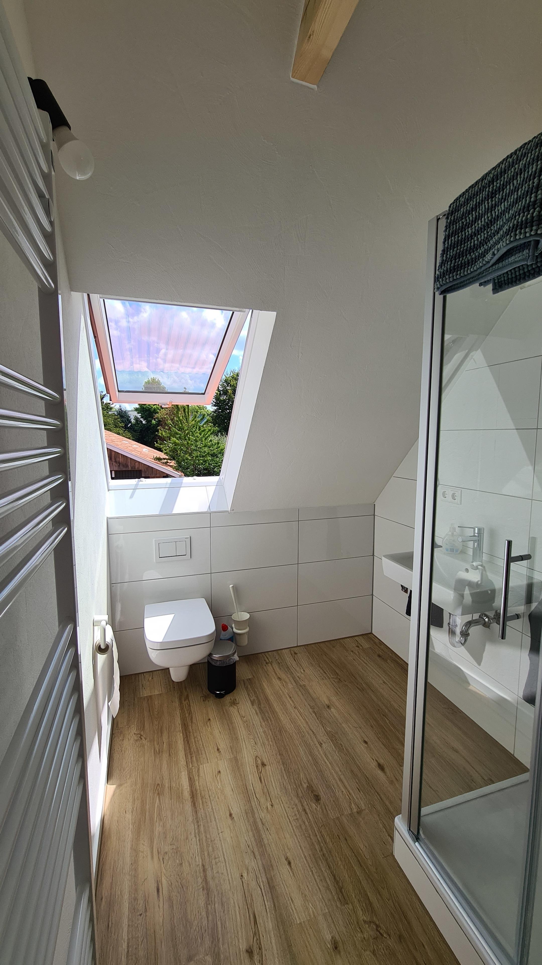 Das kleine Badezimmer mit moderner Dusche liegt direkt zwischen Eltern- und Kinderzimmer, in dem zwei Einzelbetten stehen.