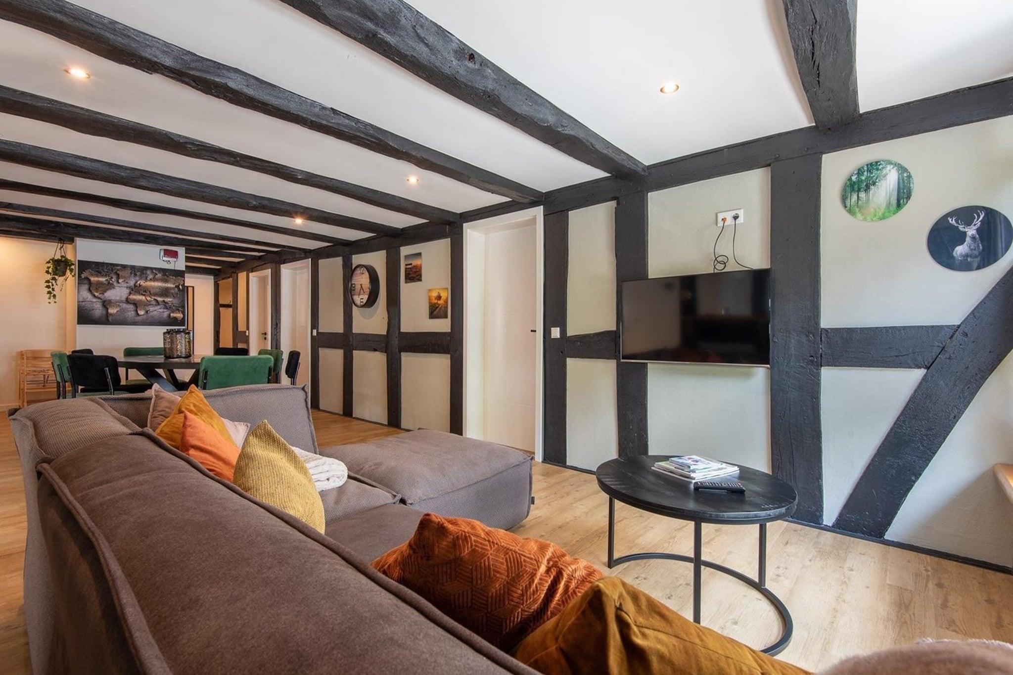 You enter the very spacious holiday home for 12 people through the hall with cloakroom (280m2 in total). On the first floor you will find a spacious, luxurious living room, a fully equipped modern kitchen and a large dining table with plenty of space. On the same floor there are 2 bedrooms with 2 double beds. One bedroom has a double bed and 2 single beds. The 2 spacious bathrooms have a rain shower and a sink. The 2 separate toilets have a sink. On the 2nd floor you will also find a spacious, luxurious living room, a fully equipped modern kitchen and a large dining table with plenty of space. There are 2 bedrooms with 2 single beds. The 2 spacious bathrooms have a rain shower and a sink. The separate toilet has a sink. On the premises there is a cozy wooden pavilion next to a campfire area. Here you can enjoy a snack or a drink in the evening and of course there is also a grill. In total there is a 1600 m2 plot surrounding the house with a nice large lawn for the children to play or play football. There is enough space for everyone to let off steam. Freshly laundered linens are provided for all guests. The Haus Zur Mühle is a beautiful historic building that has a lot of history with it. It was built in 1790 and renovated in 2022. Due to its historical value, it is listed, which means it is a listed building that preserves its historical and cultural value. It was originally a water mill and has been converted into modern and luxurious apartments. This allows guests to enjoy modern amenities in a historic building. The Haus zur Mühle in Elkeringhausen is located in the middle of a natural environment. This offers guests the opportunity to enjoy the beauty of nature and the tranquil surroundings. Just a 3-minute drive from Winterberg, you'll have easy access to the amenities and activities this popular destination has to offer. Within walking distance there is a children's playground with a beautiful pond. Haus Zur Mühle is a beautiful place for a vacation with family or friends with a combination of history, nature and modern amenities.