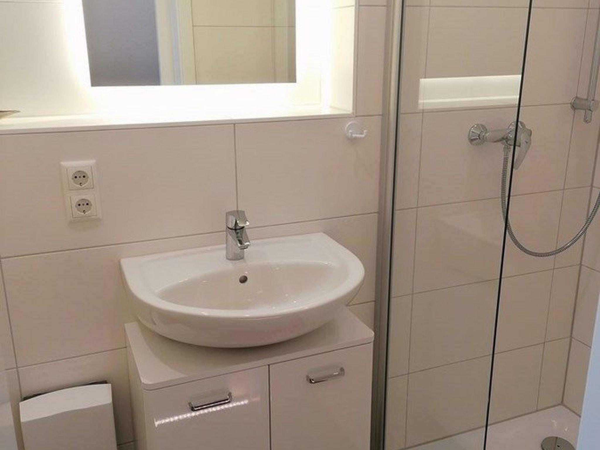 - Badezimmer mit Dusche, WC, Waschbecken, Spiegelschrank