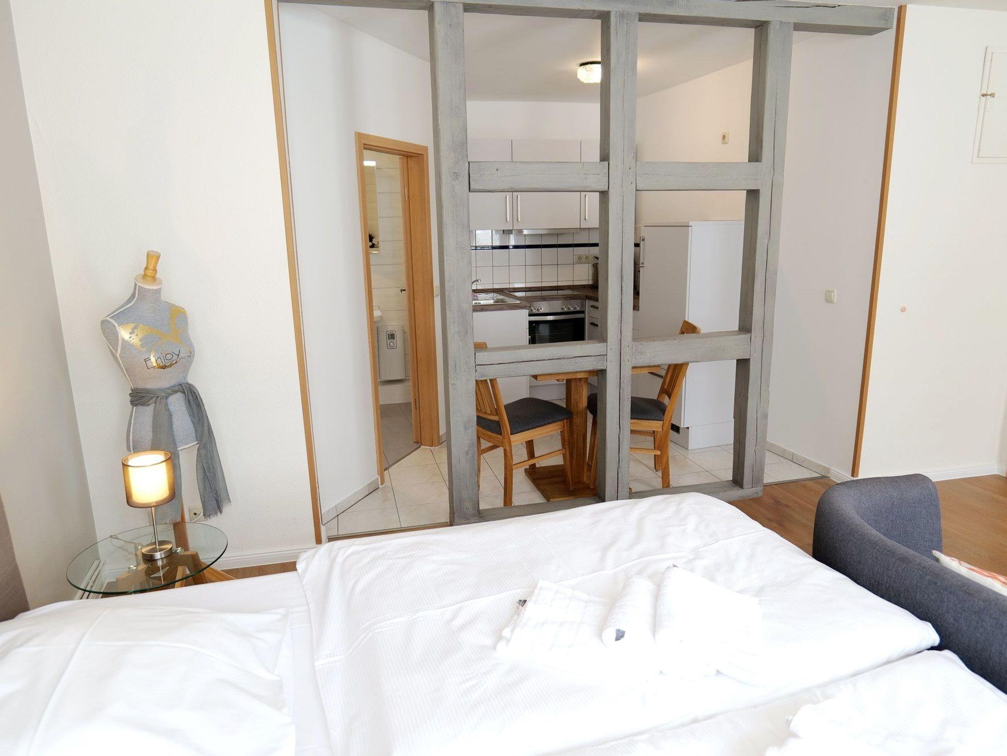 Schon im Alten Stadtbuch der Hansestadt Wismar, angelegt 1680, ist das Haus Nienstadt 9 als eine von drei Buden unter einem Dach verzeichnet. Als Buden wurden in norddeutschen Küstenstädten im Mittelalter kleine Häuser armer Leute beschrieben, die neben den Giebelhäusern der gut betuchten Kaufleute das Altstadtbild prägten. Aber keine Sorge, in den Ferienwohnungen der Herberge KAFFETIET ist es heute weder eng noch ärmlich. Das gehobene, Hotelstandard zählende, Ferienappartement ist gut 30 qm groß, mit textilen Hotelbodenbelag versehen, verfügt über eine voll ausgestattete Küchenzeile, nebst Elektroherd, Geschirrspüler, Kühlschrank, Wasserkocher, Kaffeemaschine, Besteck, Geschirr usw., dazu ein neu gefliestes Duschbad mit Echtglasduschen, gemütlichen Boxspringbett mit Taschenfederkernmatratzen, Flachbildschirm-Kabel-TV und einer behaglichen Sitzecken.