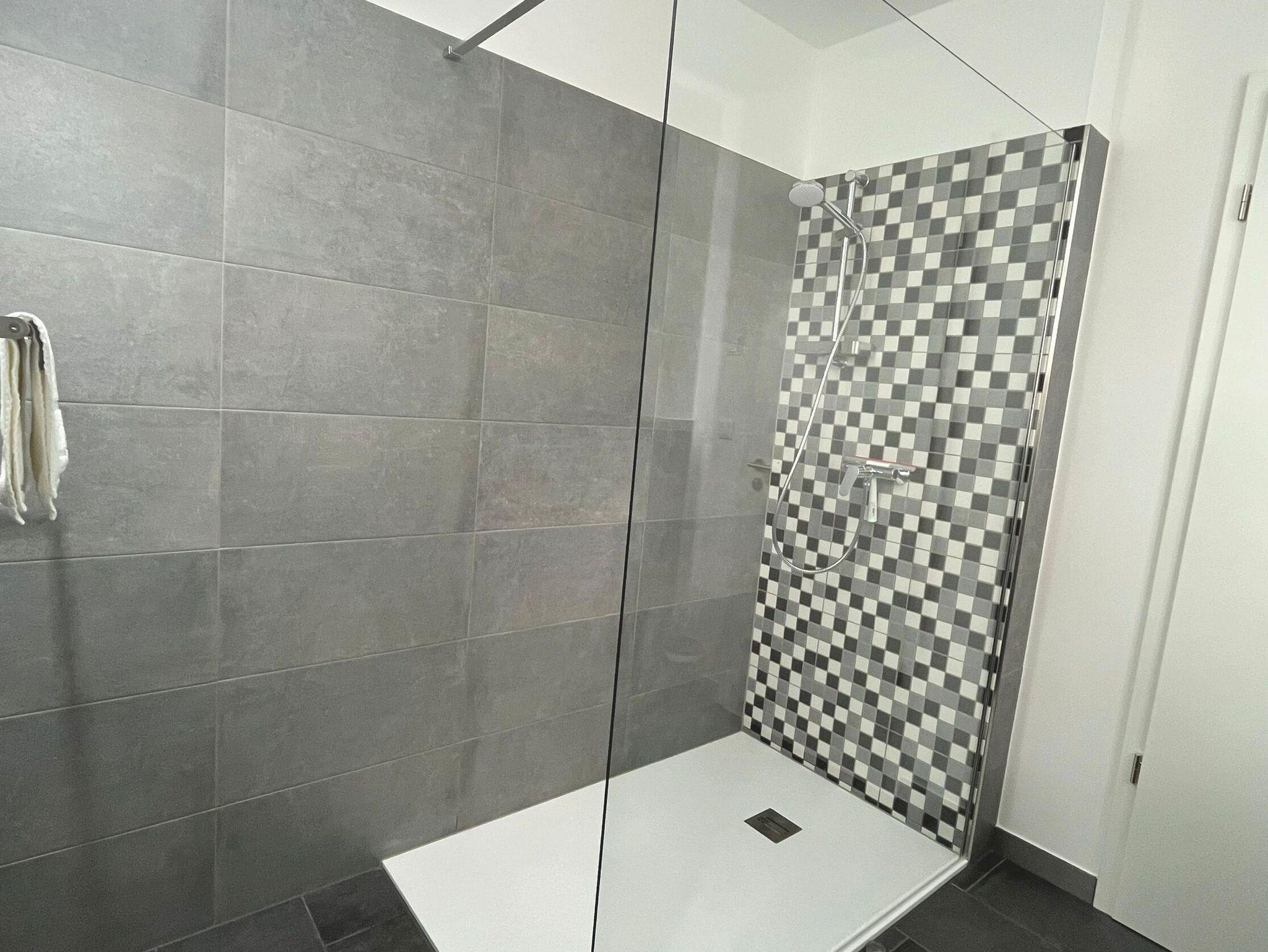 - bodenebene Dusche (90 x 1,20m), WC, Spiegel, Kosmetikspiegel und Ablage