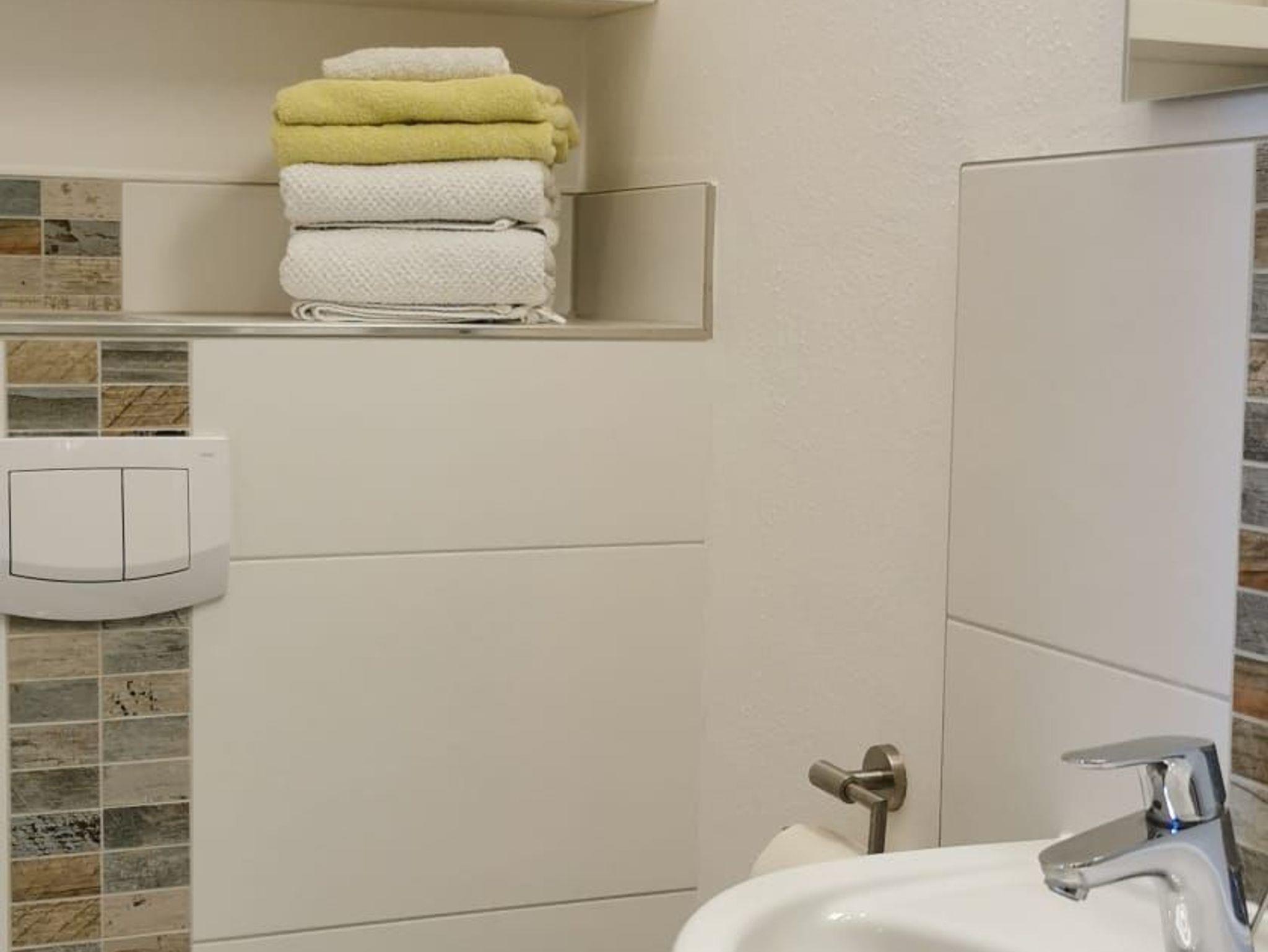 - 1 Bad mit Dusche / WC, Handtuchhalter, Spiegel, Ablage, Fön