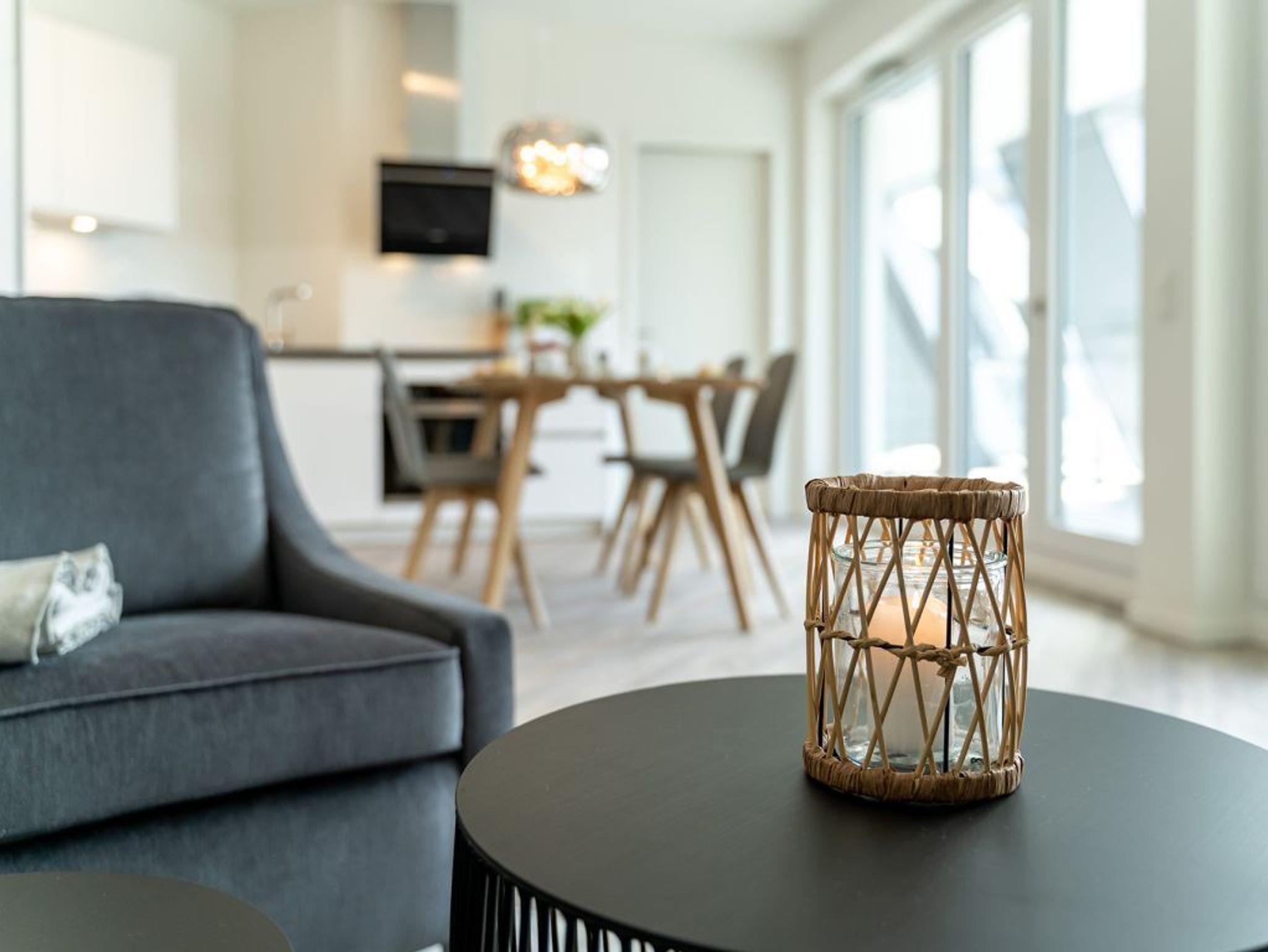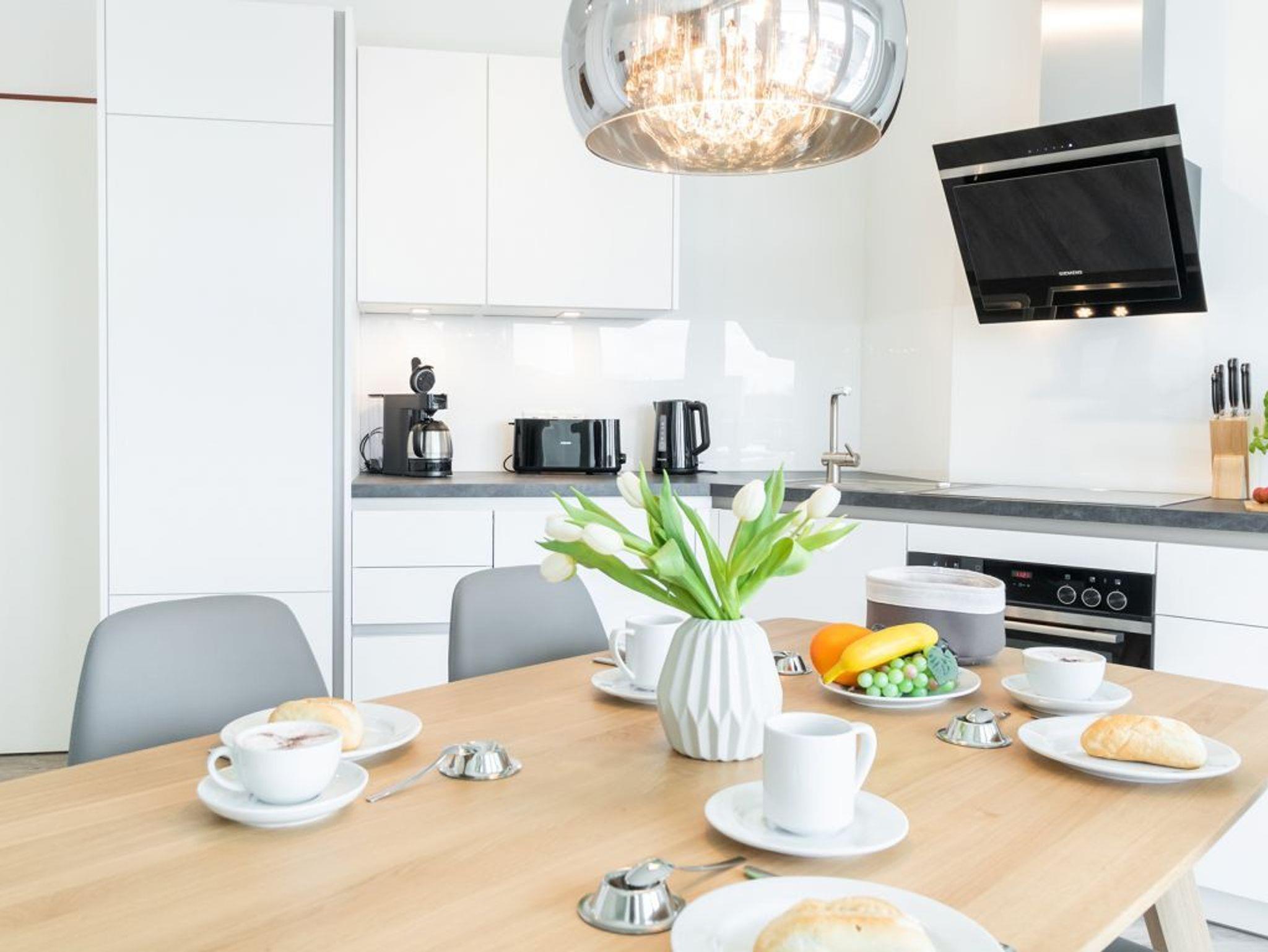 Für Technische Unterhaltung nutzen Sie gerne den Flachbild Fernseher sowie das Internetradio mit Hotelmodus. Selbstverständlich ist auch WLAN kostenfrei vorhanden. Die in den Wohnbereich integrierte Küche ist offen und voll ausgestattet mit Ceranfeldherd, Backofen, Mikrowelle, Kühlschrank, Spülmaschine zudem Wasserkocher, Toaster und Kaffeemaschine, wodurch bei Bedarf die perfekte Selbstversorgung ermöglicht ist. Ihre Urlaubsmahlzeiten nehmen Sie an einem großen Esstisch ein.