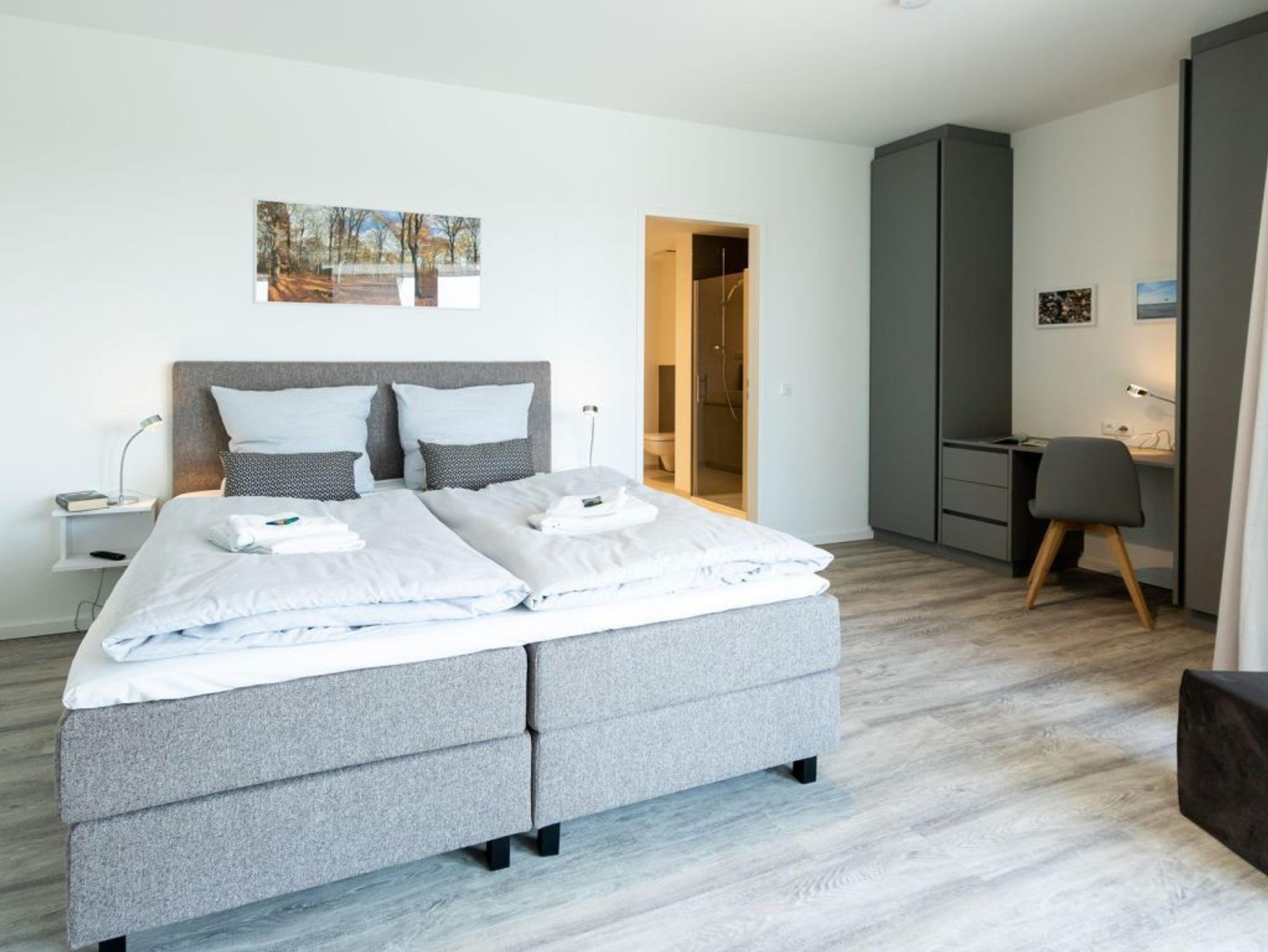 Angenehme Nächte verbringen Sie in dem separaten Schlafzimmer mit Doppelbett, Kleiderschrank sowie Zugang zu einem Badezimmer mit Dusche und WC. Das Ferienappartement besitzt zudem ein zweites, innenliegendes Gäste-WC. Die Wohnräume sind mit elektrisch bedienbaren Außenrollos ausgestattet und im gesamten Domizil sorgt eine Fußbodenheizung für ein angenehmes Raumklima.