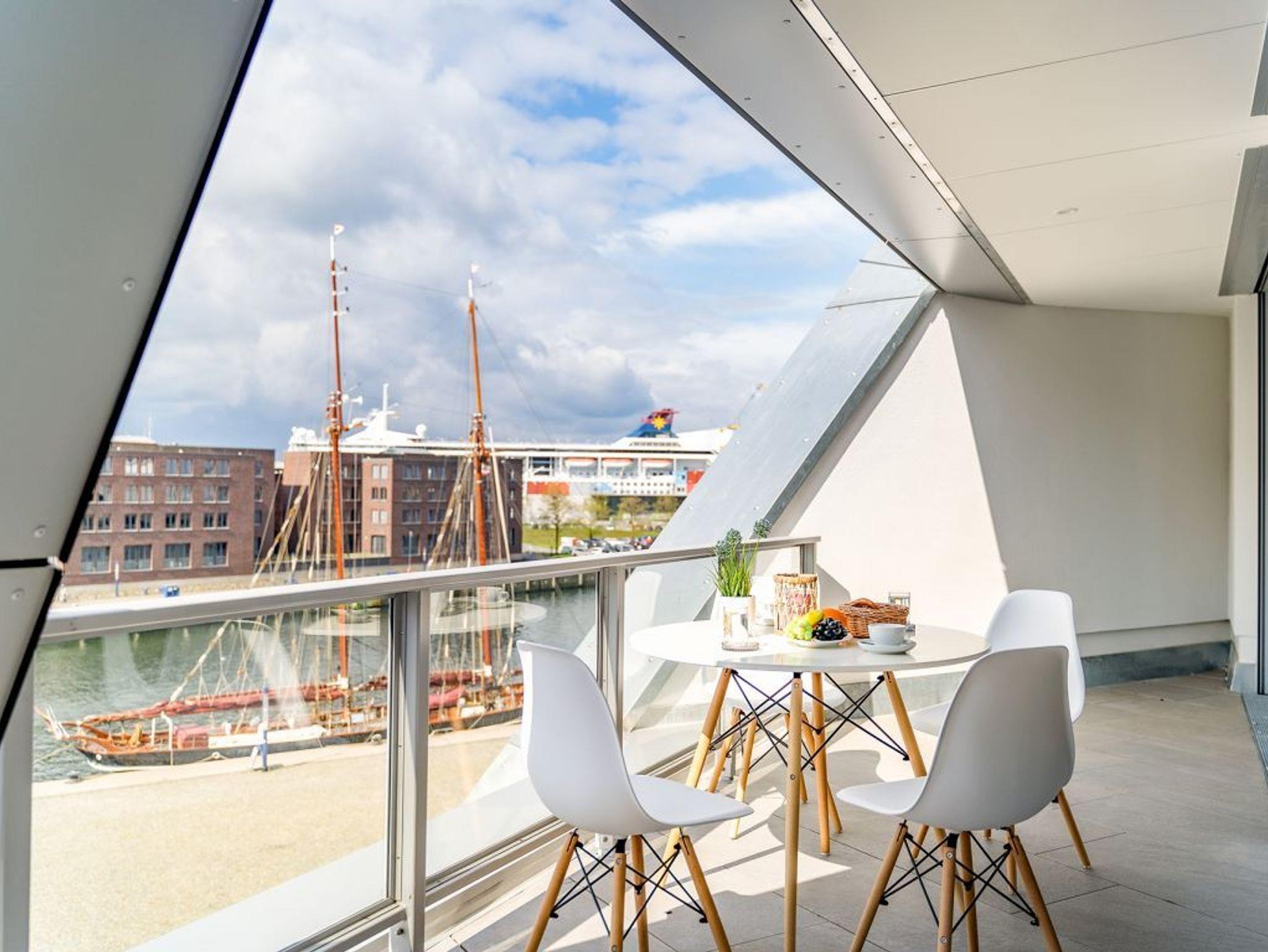 Hier empfängt die traumhaft schöne 2-Zimmer-Ferienwohnung in der Hafenspitze 38 den anspruchsvollen Gast. Es begrüßt Sie eine großzügige Wohneinheit mit einer Wohnfläche von 75qm sowie einer zugehörigen 20qm Loggia mit Hafenblick. Die im 3. Obergeschoss liegende Wohneinheit ist für eine Belegung mit maximal 4 Personen eingerichtet. Im attraktiv möblierten Wohn-Essbereich bietet ein ausklappbares Sofa zwei zusätzliche Schlafgelegenheiten.