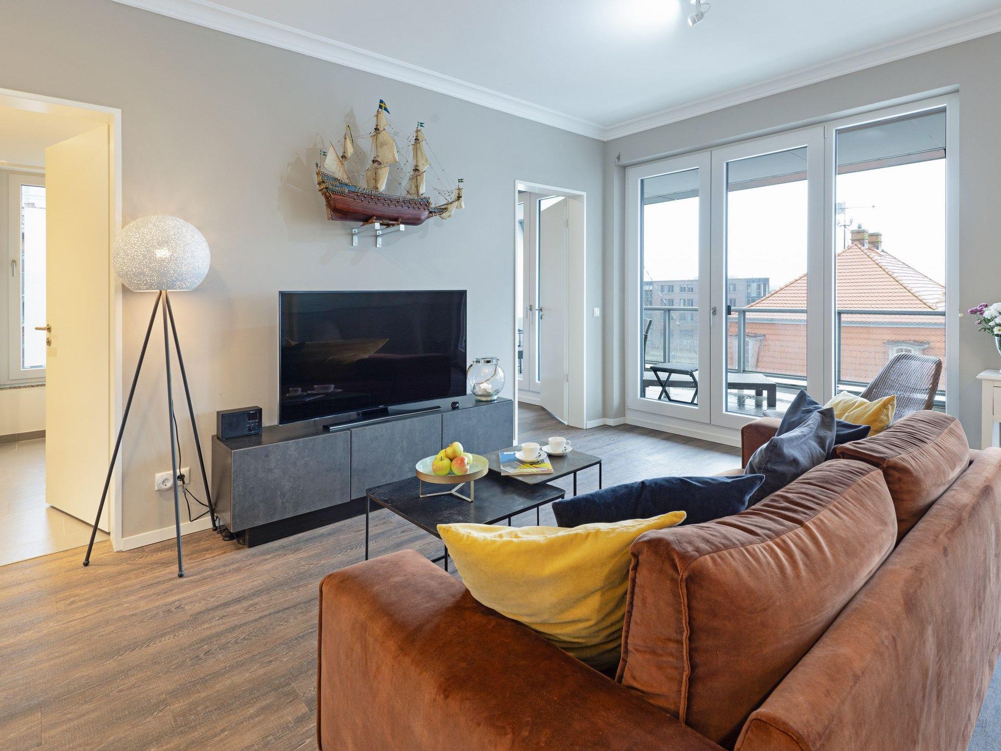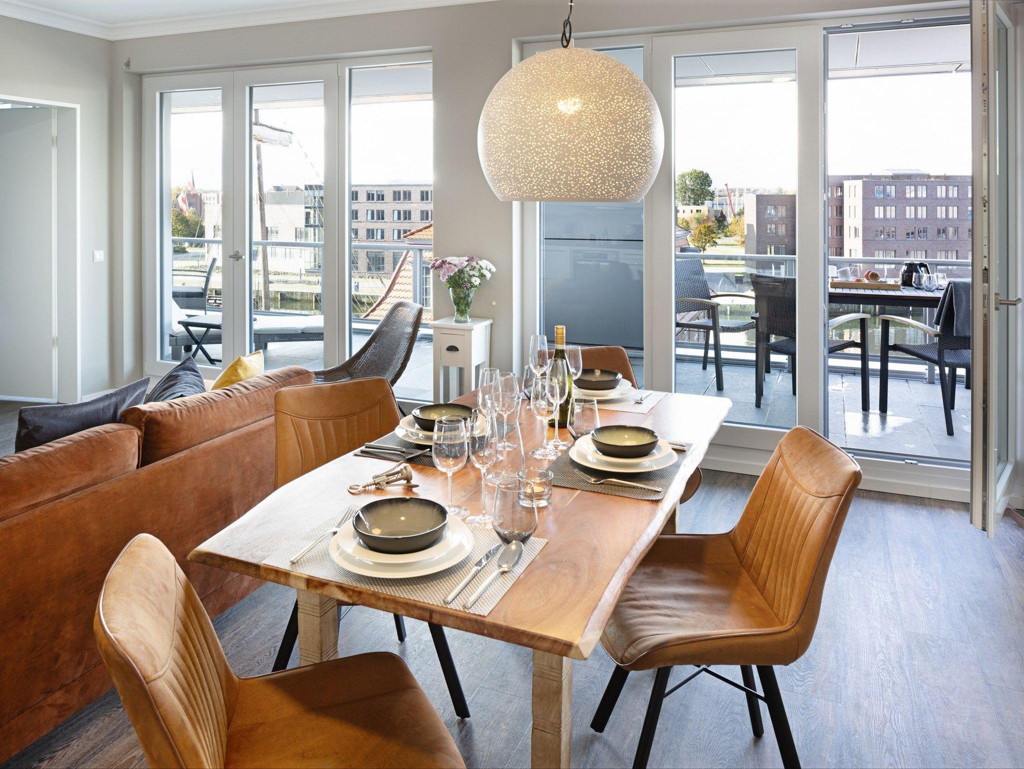 Es empfa?ngt Sie der mit viel Liebe zum Detail ausgestattete lichtdurchflutete und luftige Wohnbereich mit zwei bodentiefen Doppelflu?gel- Fenstertu?ren zur Dachterrasse (Ausfu?hrung „Stulp“, d. h. vollfla?chig zu o?ffnen ohne Mittelpfosten). Auch aus den Schlafzimmern gelangen Sie u?ber die Doppelflu?geltu?ren direkt auf Ihre sichtgeschu?tzte Sonnenterrasse in Su?d-West-Lage. Die saisonal mit Lounge-Mo?beln, bequemen Liegen und einem Esstisch mit vier Stu?hlen mo?blierte Loggia la?dt Sie zum chilligen Ausspannen ein. Freuen Sie sich auf kulinarische Genu?sse unter freiem Himmel, genießen Sie den lauen Sommerabend mit spektakula?rer Aussicht bei einer sanften Brise und einem ku?hlen Getra?nk. Da Sie direkt im Alten Hafen logieren, ko?nnen Sie auf der Terrasse je nach Windrichtung dem Rauschen des Meeres lauschen. Riechen und schmecken Sie unsere wohltuende Meeresbrise. Das Terrassenmobiliar inklusive passender Auflagen steht Ihnen ganzja?hrig zur Verfu?gung.