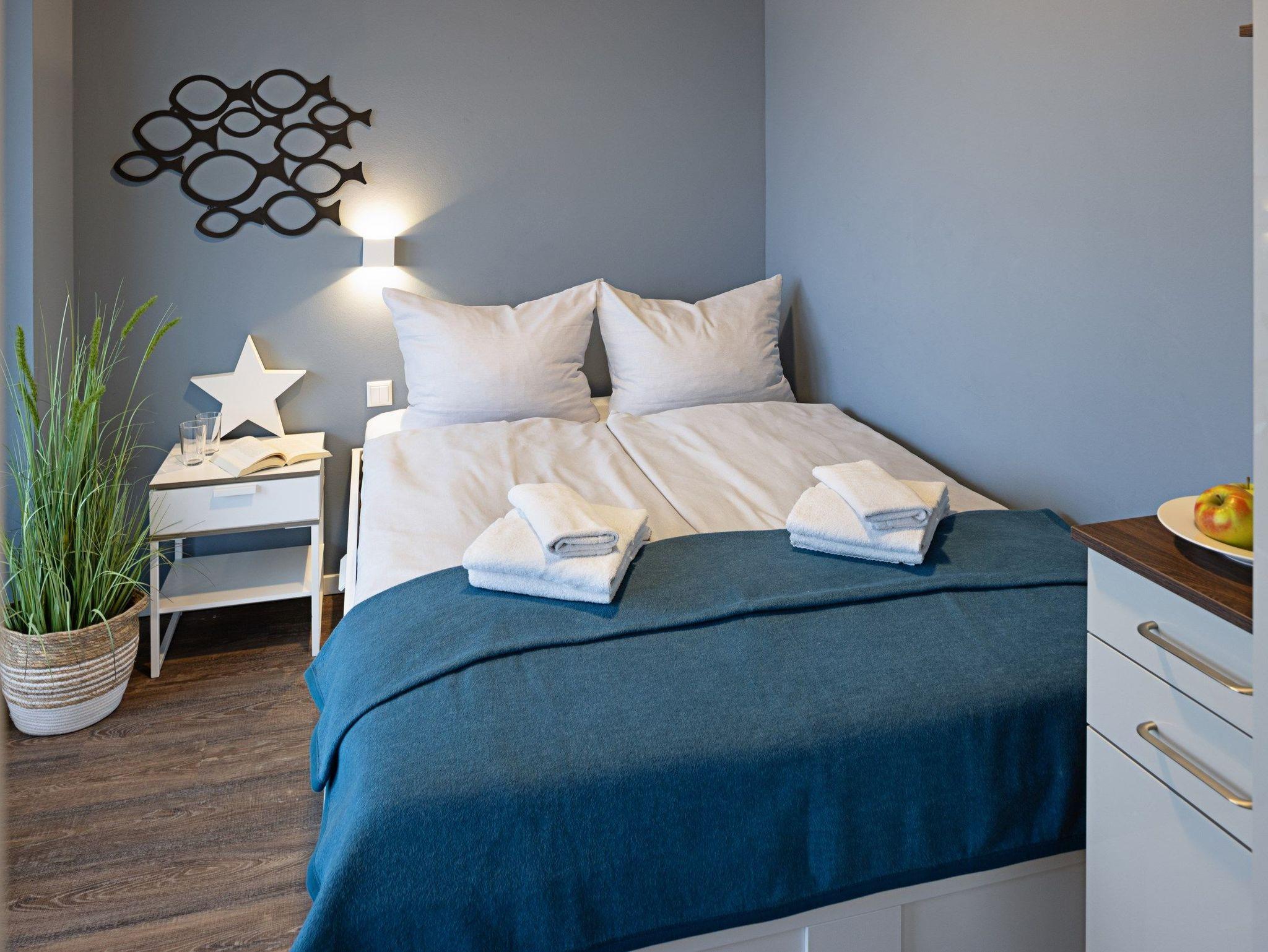 Die beiden separaten komfortablen Schlafra?ume sind mit hochwertigen bequemen Boxspring-Doppelbetten (1,80 m x 2,00 m sowie 1,40 m x 2,00 m) sowie maßgefertigten Kleiderschra?nken und großzu?gigen Ablagemo?glichkeiten ausgestattet. Fu?r Ihren ruhigen und ungesto?rten Schlaf sind alle Wohn- und Schlafra?ume mit komplett verdunkelnden elektrisch gefu?hrten Aluminiumrollla?den ausgestattet. Wir wu?nschen Ihnen erholsame Tra?ume an diesem idealem Ru?ckzugsort. Zum unkomplizierten und zentralen Laden Ihrer Mobilgera?te sind dort zusa?tzliche Multimedia-Steckdosen mit jeweils drei USB-Ports sowie einem Typ-C Port mit Kindersicherung vorhanden. Die Betten haben wir fu?r Sie bereits bezogen und Handtu?cher liegen schon bereit.