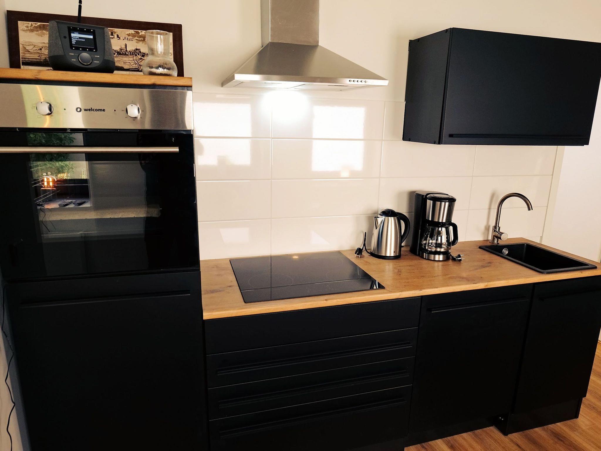 - offene Küche ausgestattet mit Geschirrspüler, Backofen, Kochfeld, Kühlschrank, Kaffeemaschine, Wasserkocher, Geschirr, Besteck, Gläser uvm.