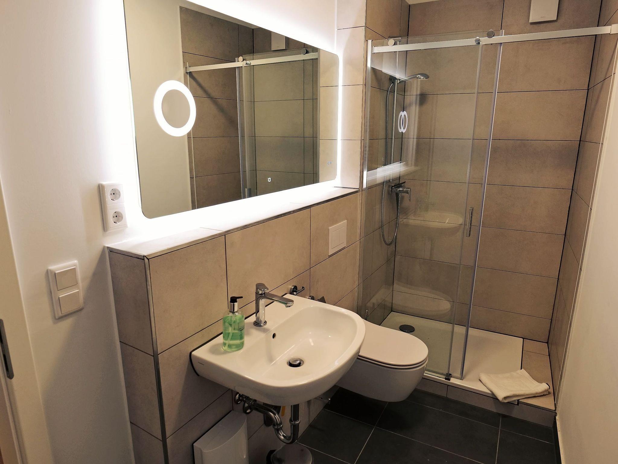 - Badezimmer mit begehbarer Dusche, WC, Waschbecken, Spiegel