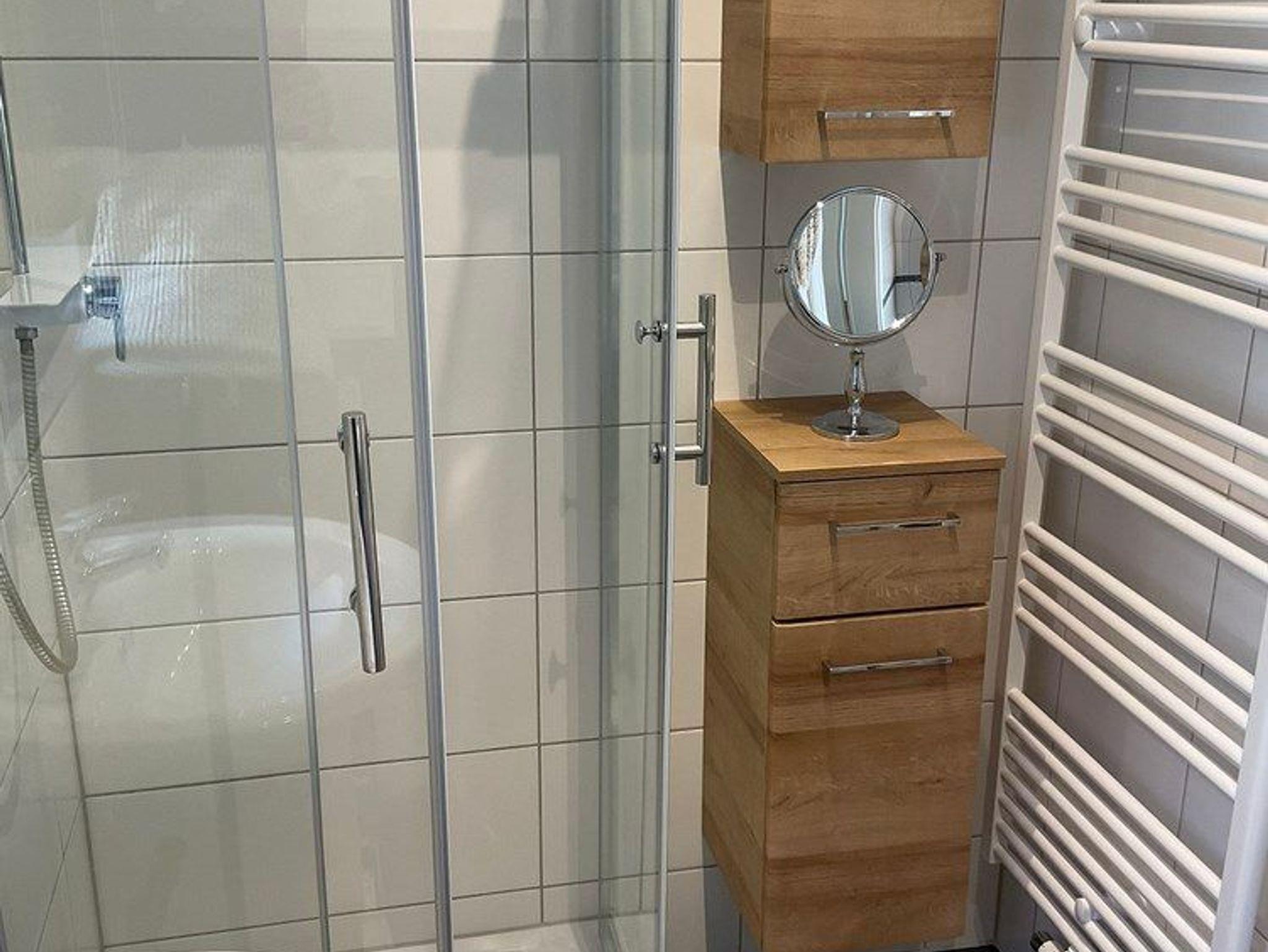 • Schickes Badezimmer mit Dusche, WC, Spiegel und ausreichend Ablagefläche für Ihre Beautyutensilien. Eine Waschmaschine und ein Wäscheständer sind vorhanden.