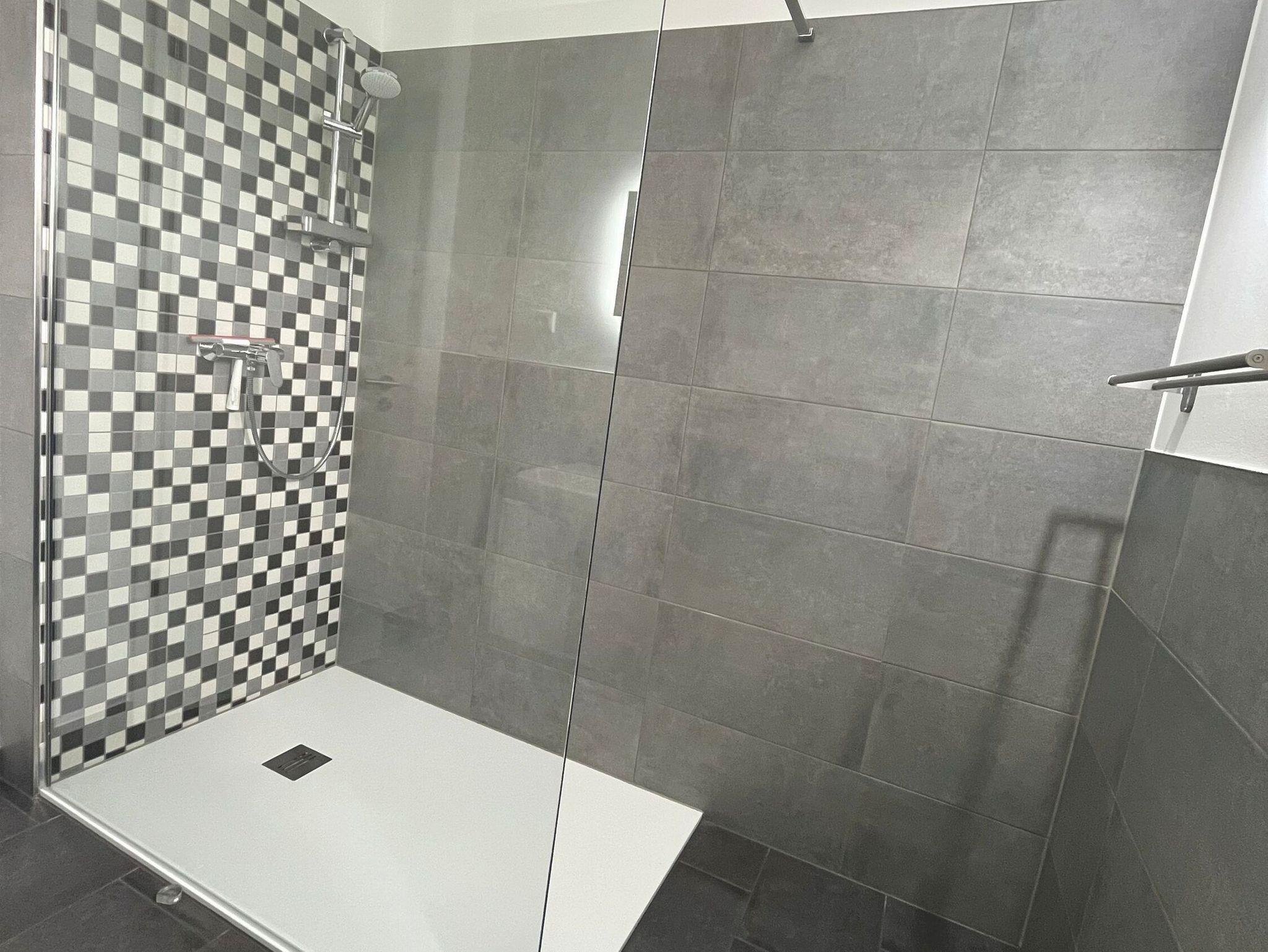- bodenebene Dusche (90 x 1,20m), WC, Spiegel, Kosmetikspiegel und Ablage