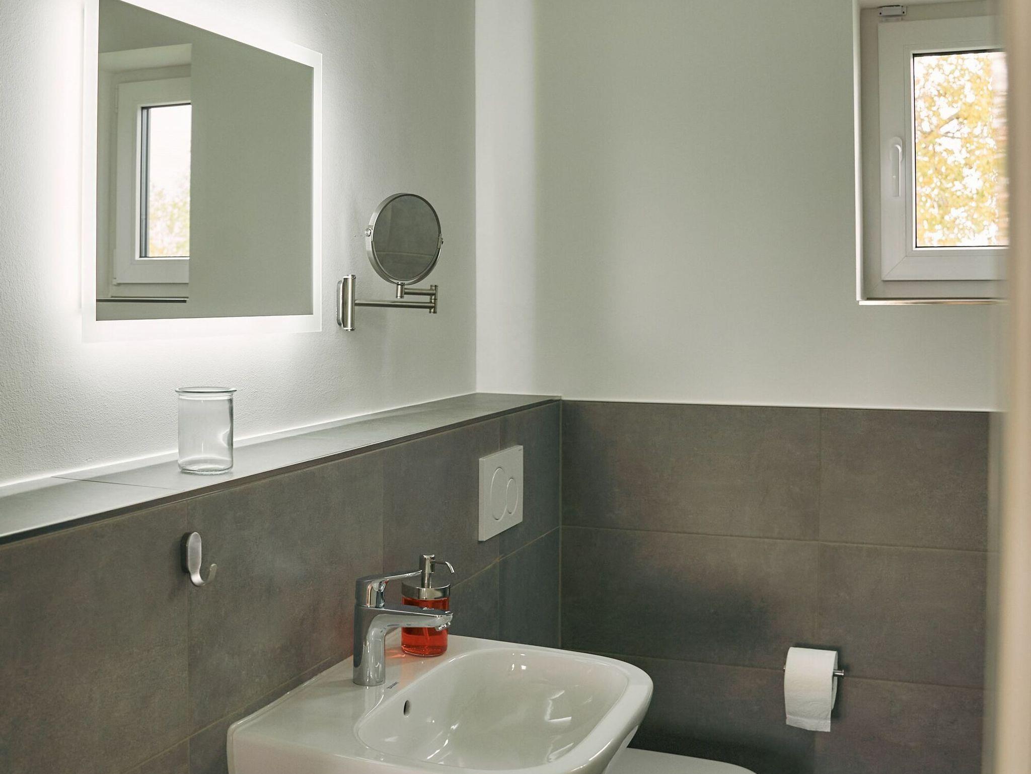 - bodenebene Dusche (90 x 1,20m), WC, Spiegel, Kosmetikspiegel und Ablage