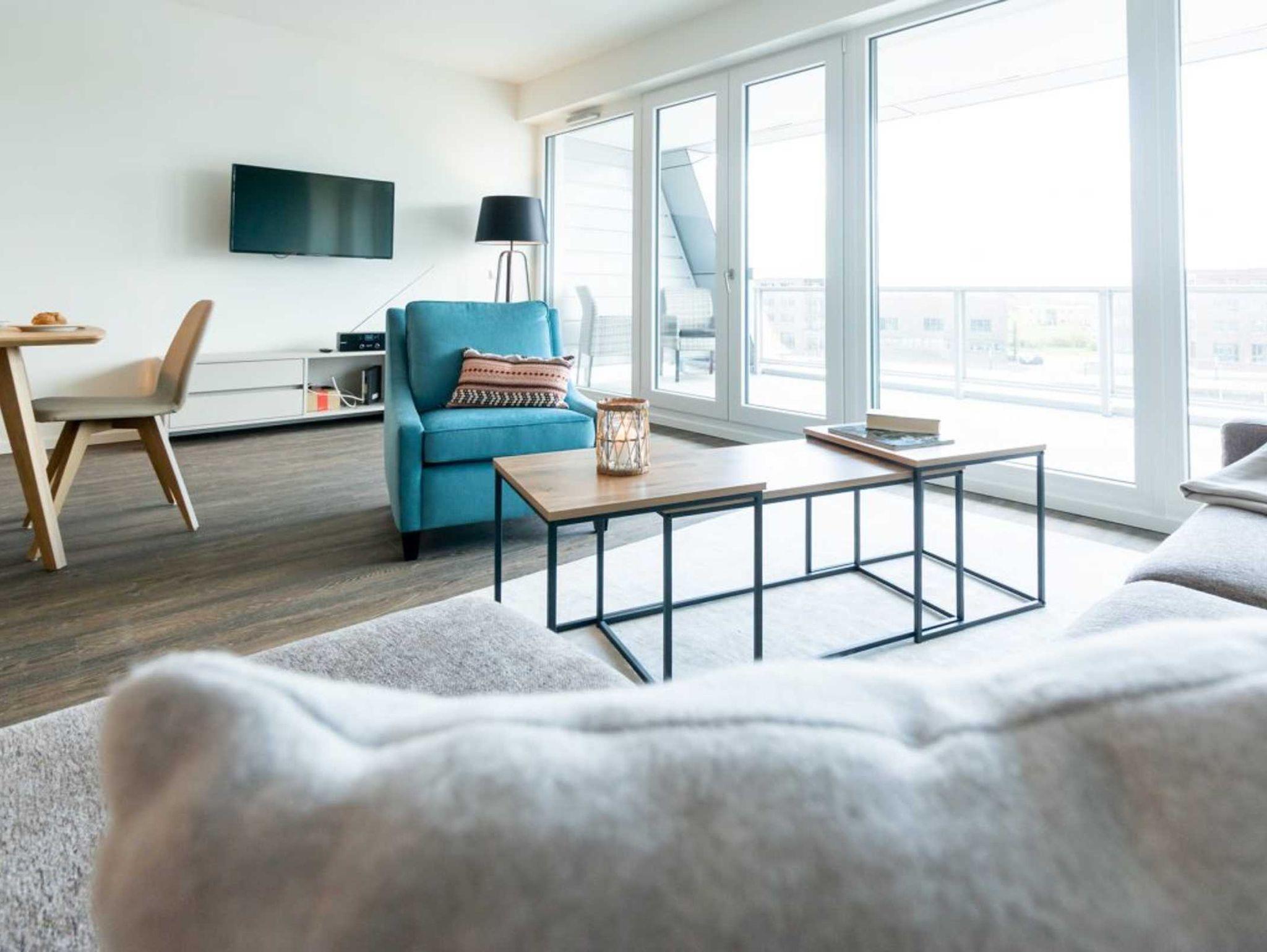 Das perfekte Urlaubsdomizil für unsere Gäste, die Wert auf großzügiges, luxuriöses Wohnen legen. Das 3-Zimmer-Appartement Hafenspitze 32 verwöhnt Sie mit einer Wohnfläche von 93qm. Eine Belegung ist mit bis zu 4 Personen möglich. Die Ferienwohnung besitzt zudem eine sonnige Loggia im Hafenblick, wobei elektrisch bedienbare Außenrollos für sommerlichen Wärmeschutz sorgen. Der einladende Wohn-Essbereich bietet eine komfortable Möblierung mit bequemer Sitzgarnitur und einem Esstisch.