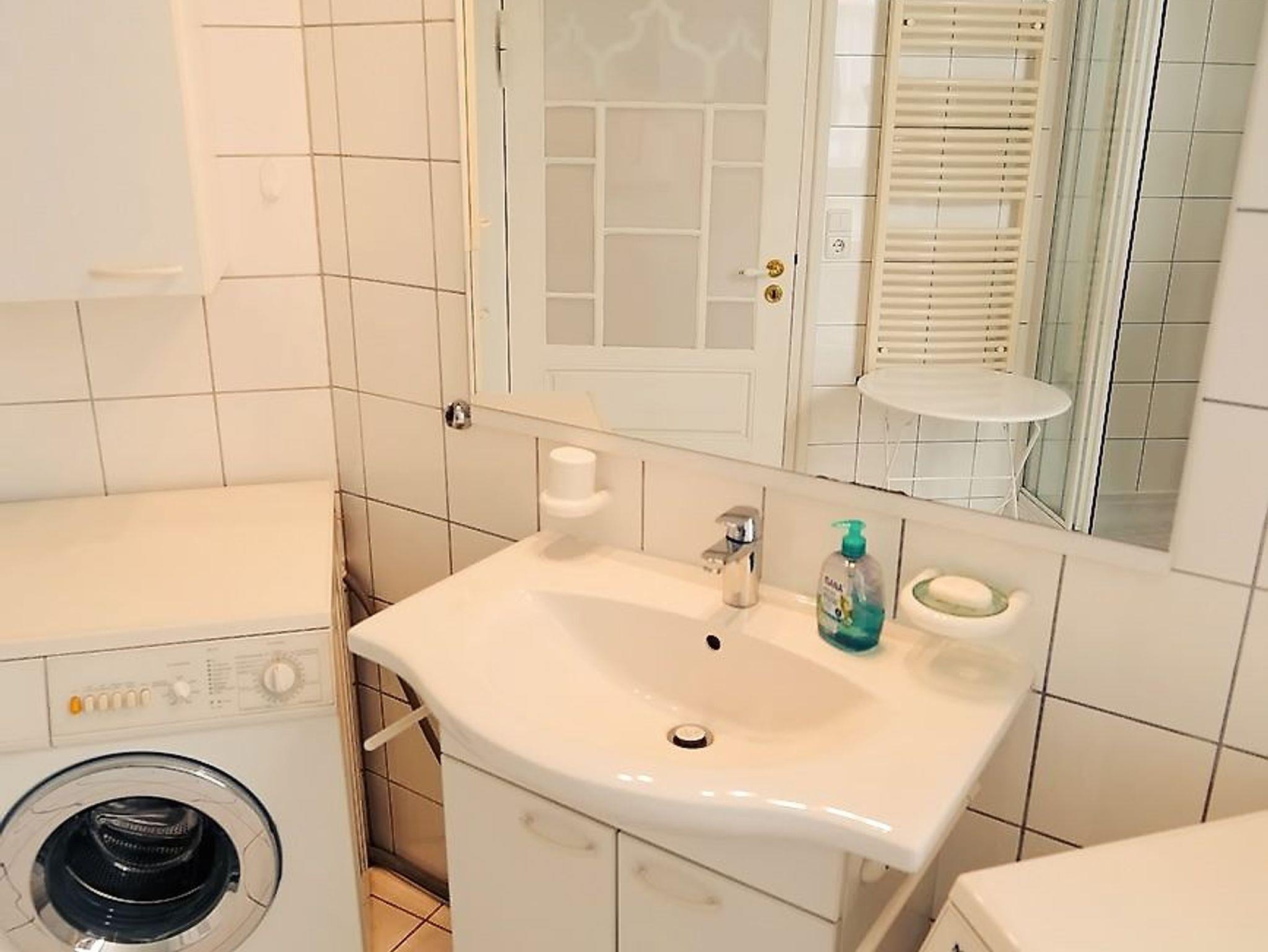 - Badezimmer mit Dusche, WC, Waschmaschine und Trockner, Spiegel und Ablage (Fön)