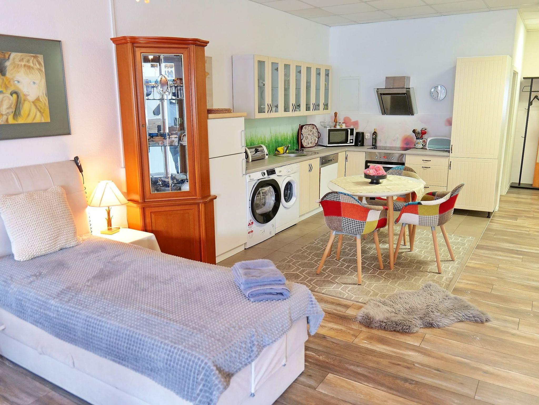 1 offene Küche vollausgestattet (Geschirrspüler, Kühlschrank mit Gefrierschrank, Backofen, 4-Platten-Ceran-Herd, Toaster, Kaffeemaschine, Backofen, Geschirr, Besteck uvm.) mit Esstisch für 4 Personen