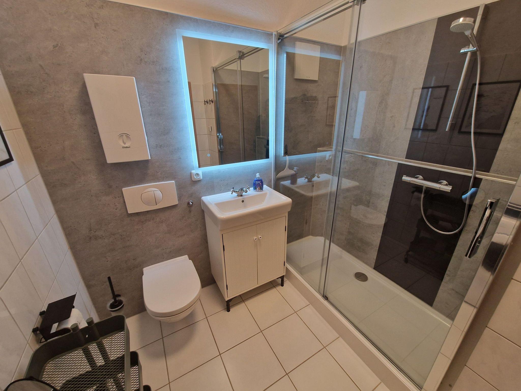 - modernes Duschbad mit Dusche, Spiegelschrank, WC und Waschmaschine