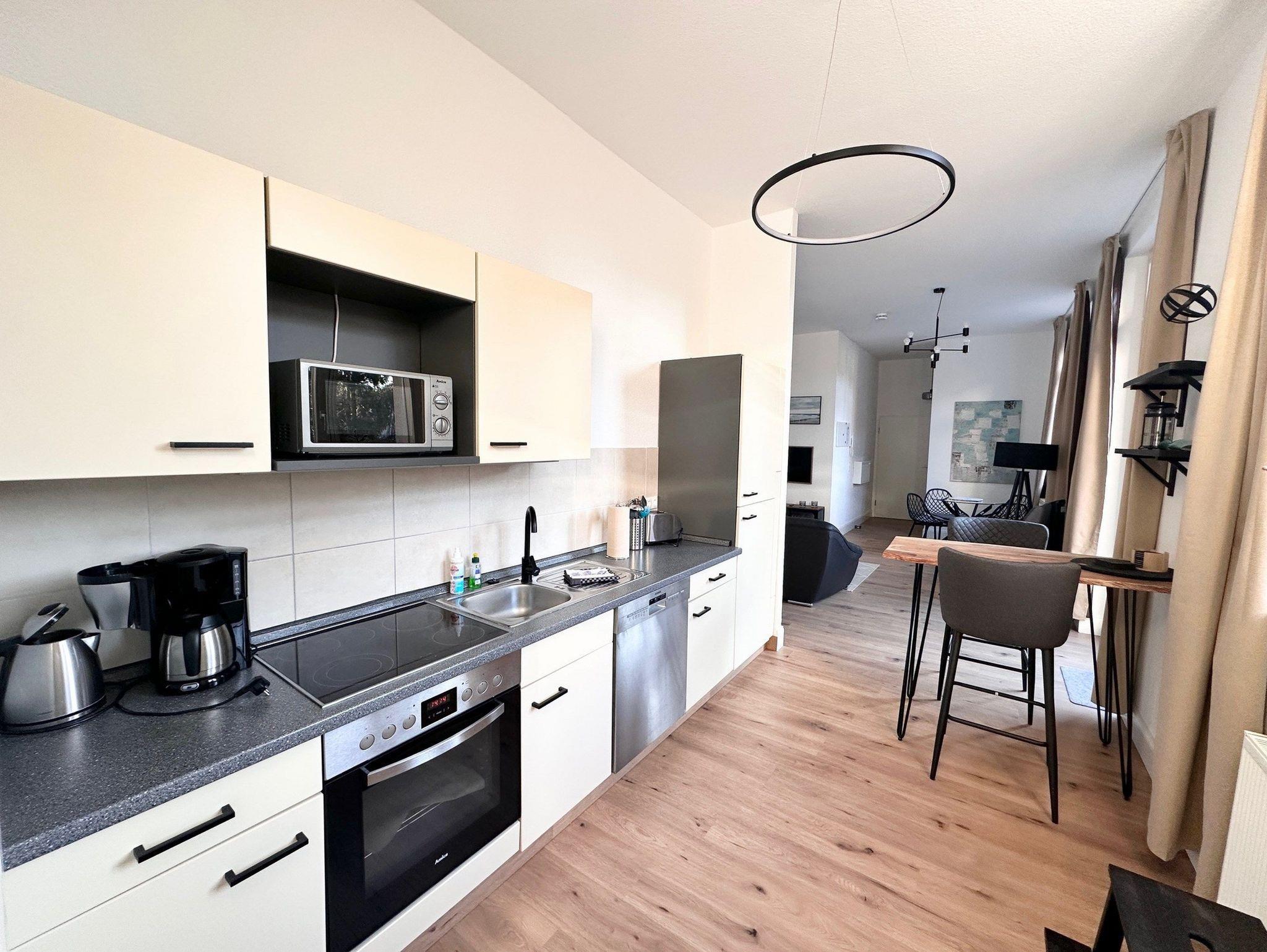 • Moderne helle Küche mit Backofen, Ceranherd, Wasserkocher, Kaffeemaschine, Geschirrspüler, Kühlschrank, Mikrowelle, Toaster, Geschirr, Gläser, Besteck uvm..