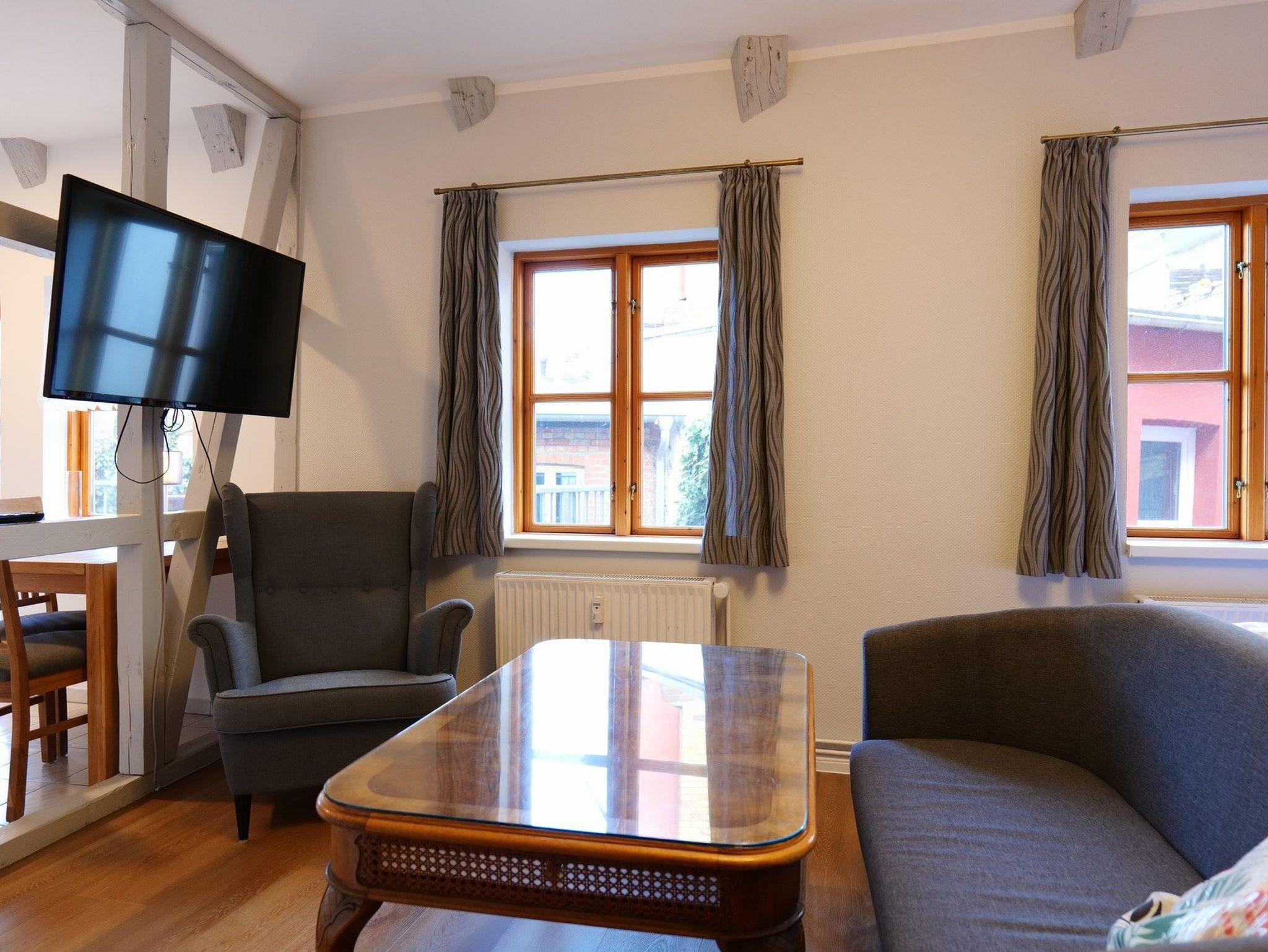 Schon im Alten Stadtbuch der Hansestadt Wismar, angelegt 1680, ist das Haus Nienstadt 9 als eine von drei Buden unter einem Dach verzeichnet. Als Buden wurden in norddeutschen Küstenstädten im Mittelalter kleine Häuser armer Leute beschrieben, die neben den Giebelhäusern der gut betuchten Kaufleute das Altstadtbild prägten. Aber keine Sorge, in den Ferienwohnungen der Herberge KAFFETIET ist es heute weder eng noch ärmlich. Das gehobene, Hotelstandard zählende, Ferienappartement ist gut 30 qm groß, mit textilen Hotelbodenbelag versehen, verfügt über eine voll ausgestattete Küchenzeile, nebst Elektroherd, Geschirrspüler, Kühlschrank, Wasserkocher, Kaffeemaschine, Besteck, Geschirr usw., dazu ein neu gefliestes Duschbad mit Echtglasduschen, gemütlichen Boxspringbett mit Taschenfederkernmatratzen, Flachbildschirm-Kabel-TV und einer behaglichen Sitzecke. Zur Wohnung gehört ebenfalls ein eigener Balkon.
