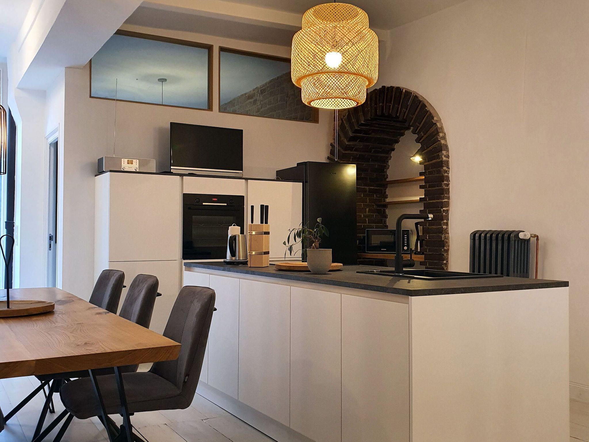 - offene Küche ausgestattet mit Geschirrspüler, Backofen, Induktionsherd, Kühlschrank, Kaffeemaschine, Wasserkocher, Geschirr, Besteck, Gläser uvm.