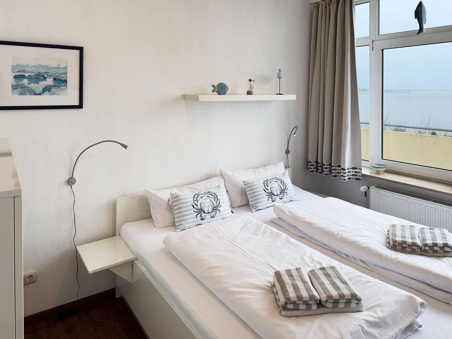 Die Ferienwohnung „Wattkieker" im Hochparterre des Hauses „Nordenlicht" in Wittdün auf Amrum ist eine 2-Zimmer-Ferienwohnung (ca. 45 qm Grundfläche) mit Schlafmöglichkeiten für 1 bis 2 Personen und direktem Blick auf die Nordsee in Richtung Seezeichenhafen.