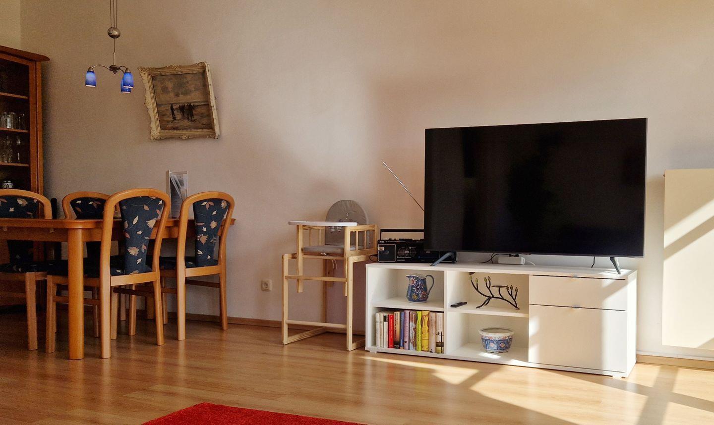 Im Wohnzimmer haben wir eine bequeme Sitzecke mit SmartTV und Zugang zum Ost-Balkon.